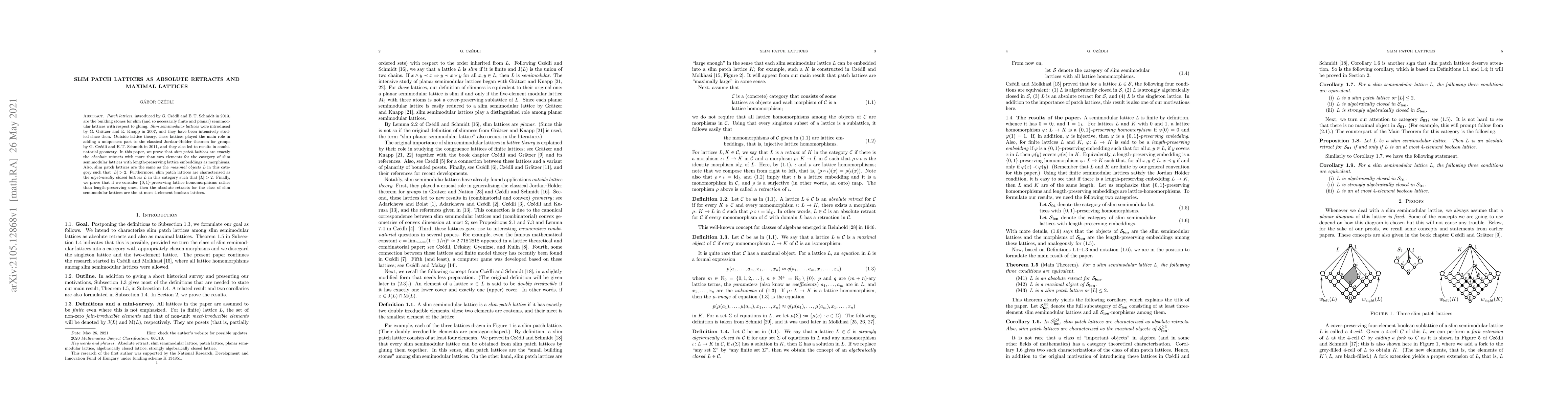 Patch lattices, introduced by G. Cz\'edli and E.T. Schmidt in 2013, are the building stones for slim (and so necessarily finite and planar) semimodular lattices with respect to gluing. Slim semimodular lattices were introduced by G. Gr\"atzer and E. Knapp in 2007, and they have been intensively studied since then. Outside lattice theory, these lattices played the main role in adding a uniqueness part to the classical Jordan--H\"older theorem for groups by G. Cz\'edli and E.T. Schmidt in 2011, and they also led to results in combinatorial geometry. In this paper, we prove that slim patch lattices are exactly the absolute retracts with more than two elements for the category of slim semimodular lattices with length-preserving lattice embeddings as morphisms. Also, slim patch lattices are the same as the maximal objects $L$ in this category such that $|L|>2$. Furthermore, slim patch lattices are characterized as the algebraically closed lattices $L$ in this category such that $|L|>2$. Finally, we prove that if we consider $\{0,1\}$-preserving lattice homomorphisms rather than length-preserving ones, then the absolute retracts for the class of slim semimodular lattices are the at most 4-element boolean lattices.