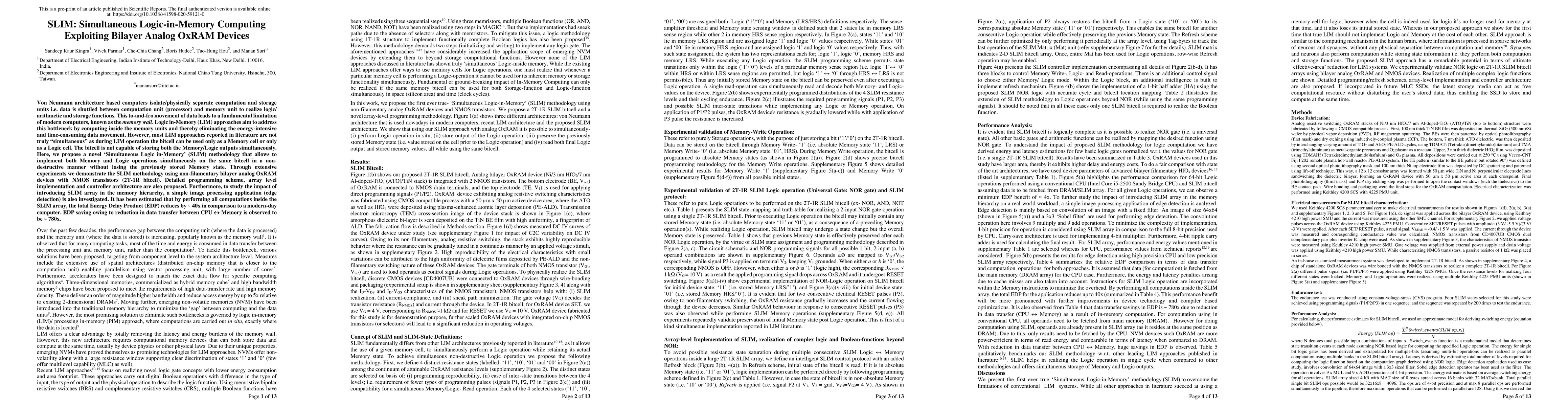 The paper proposes a novel 'Simultaneous Logic in-Memory' (SLIM) methodology using bilayer analog OxRAM devices to perform both Memory and Logic operations simultaneously on the same bitcell, reducing the energy-intensive data movement between CPU and memory. The SLIM approach demonstrates a ~40x reduction in Energy Delay Product (EDP) compared to conventional computing.