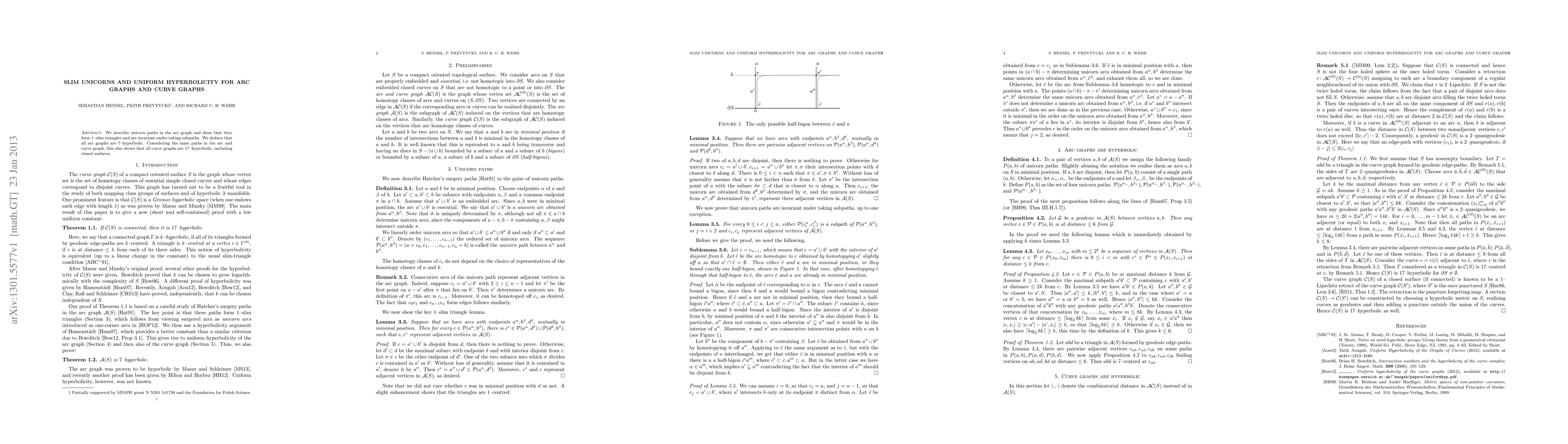 We describe unicorn paths in the arc graph and show that they form 1-slim triangles and are invariant under taking subpaths. We deduce that all arc graphs are 7-hyperbolic. Considering the same paths in the arc and curve graph, this also shows that all curve graphs are 17-hyperbolic, including closed surfaces.