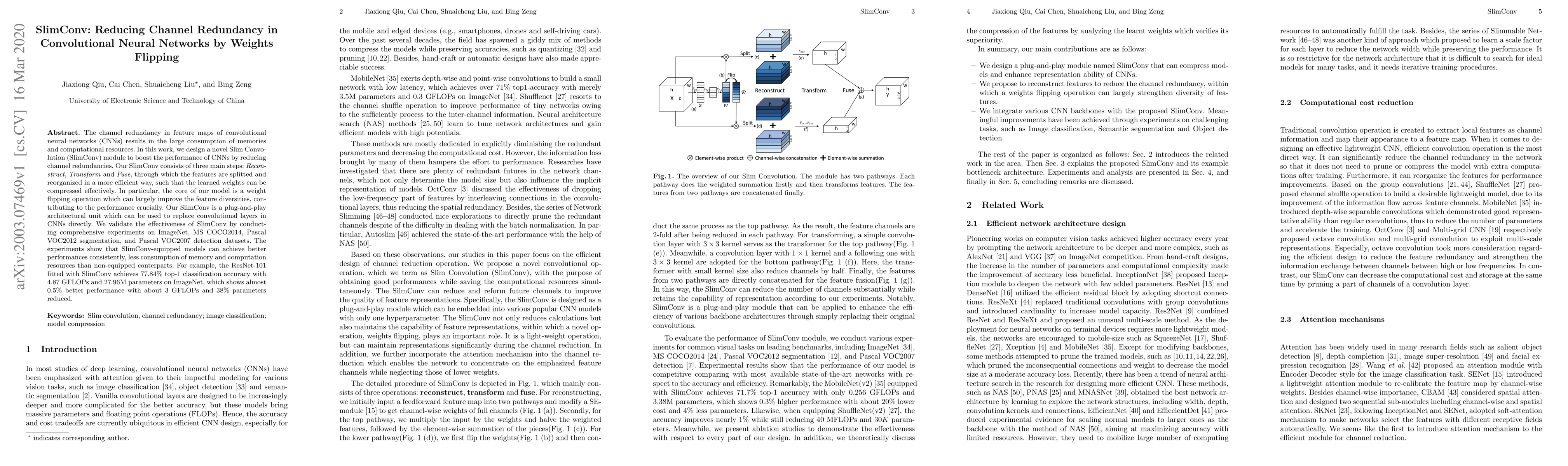 A new neural network module called SlimConv reduces memory and computational resource consumption in CNNs by using a weight flipping operation to improve feature diversity, achieving better performance with significant reductions.