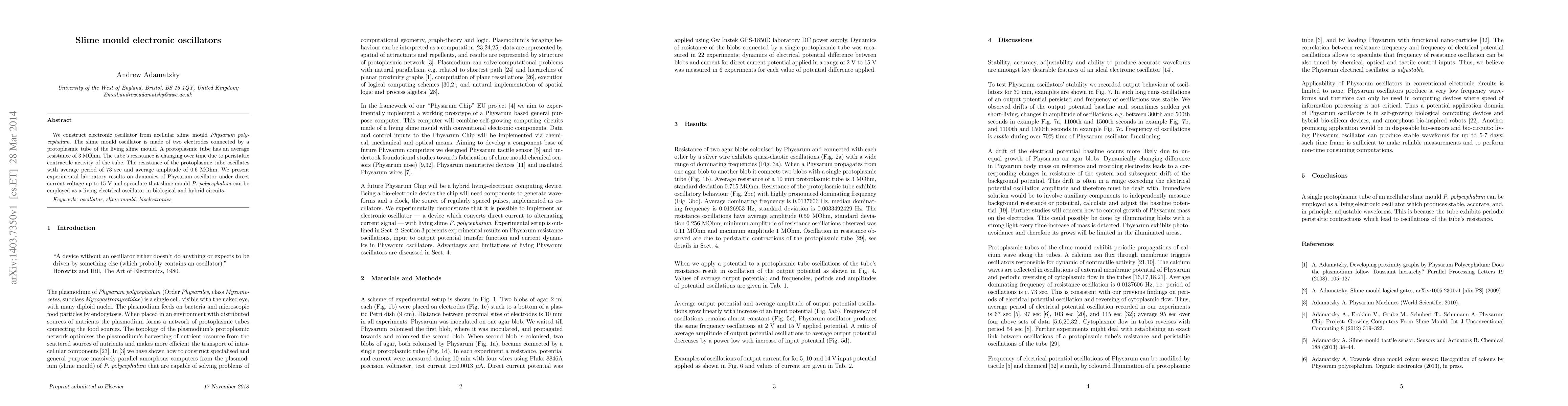 Researchers constructed an electronic oscillator using the acellular slime mould Physarum polycephalum, where a protoplasmic tube's resistance oscillates with a period of 73 seconds and an amplitude of 0.6 MOhm, suggesting potential use in biological and hybrid circuits.
