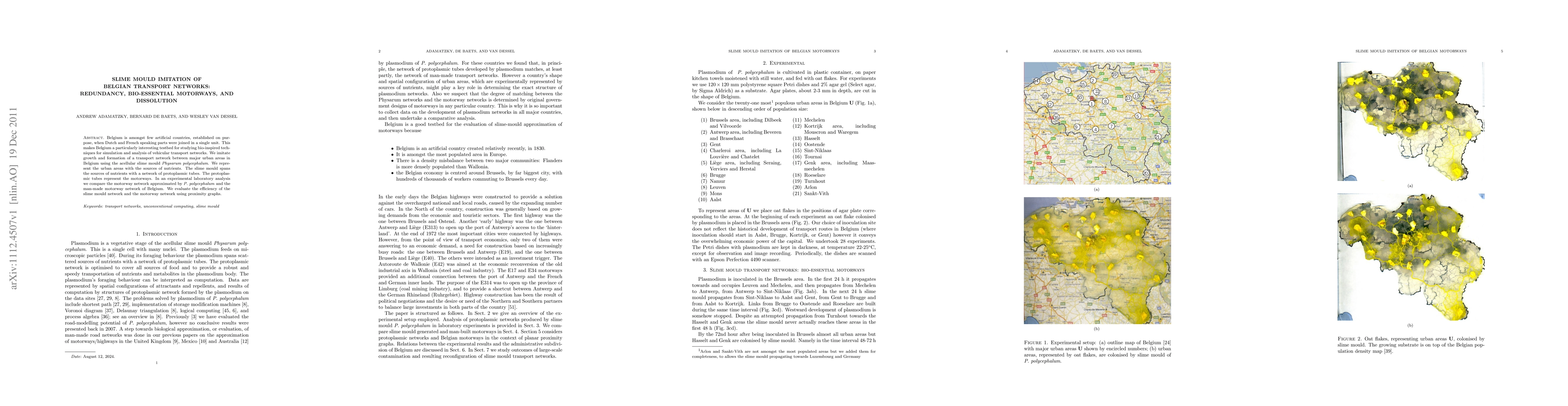 This study uses the acellular slime mould Physarum polycephalum to simulate the growth of Belgium's motorway network, representing urban areas as nutrient sources. The resulting protoplasmic tubes mimic motorways, and the efficiency of the slime mould's network is compared to Belgium's actual motorway system using proximity graphs.