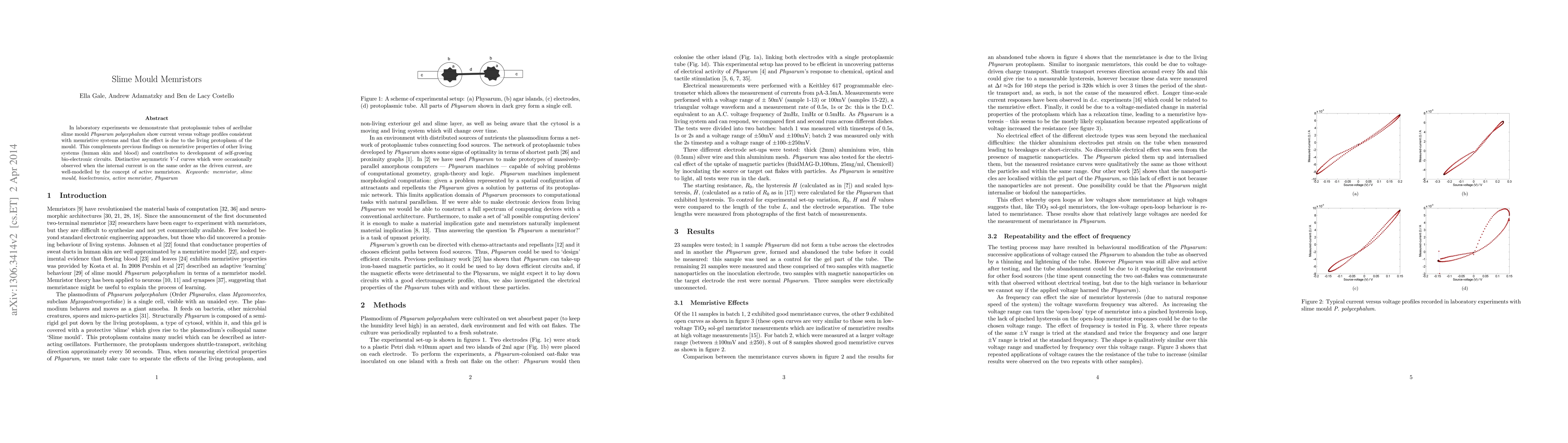 This study demonstrates that slime mould \emph{Physarum polycephalum} exhibits memristive behavior, suggesting its potential use in bio-electronic circuits. The asymmetric $V$-$I$ curves observed are modeled by the concept of active memristors, indicating a promising direction for self-growing biological electronic components.