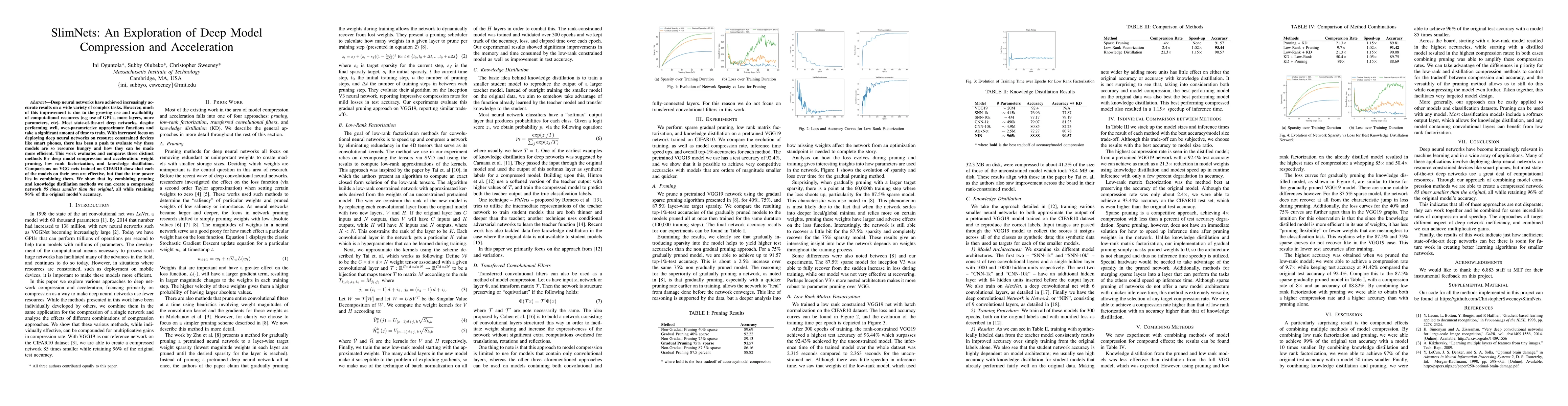Deep neural networks have achieved increasingly accurate results on a wide variety of complex tasks. However, much of this improvement is due to the growing use and availability of computational resources (e.g use of GPUs, more layers, more parameters, etc). Most state-of-the-art deep networks, despite performing well, over-parameterize approximate functions and take a significant amount of time to train. With increased focus on deploying deep neural networks on resource constrained devices like smart phones, there has been a push to evaluate why these models are so resource hungry and how they can be made more efficient. This work evaluates and compares three distinct methods for deep model compression and acceleration: weight pruning, low rank factorization, and knowledge distillation. Comparisons on VGG nets trained on CIFAR10 show that each of the models on their own are effective, but that the true power lies in combining them. We show that by combining pruning and knowledge distillation methods we can create a compressed network 85 times smaller than the original, all while retaining 96% of the original model's accuracy.