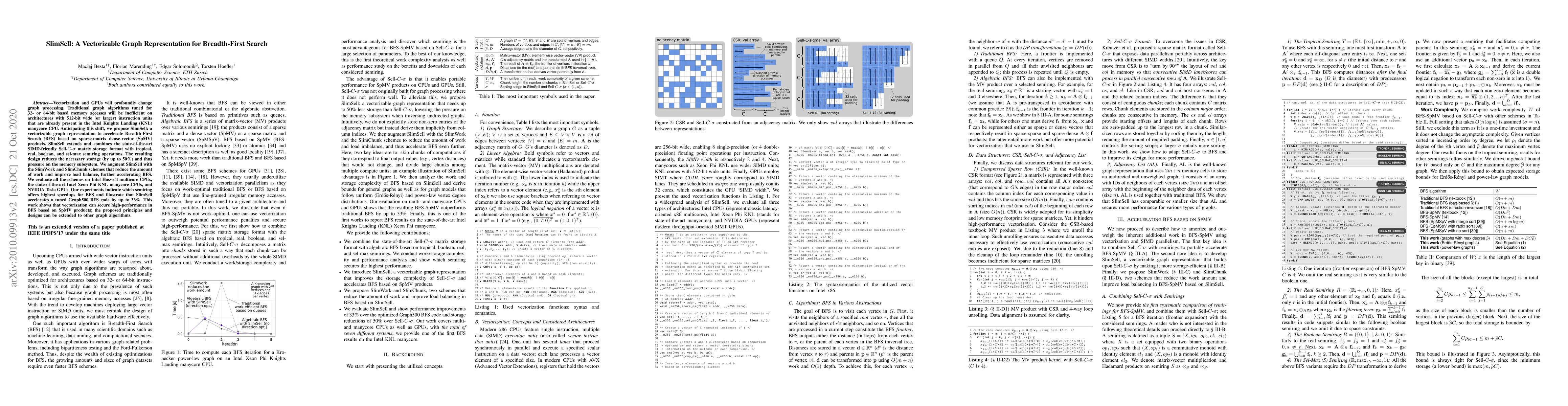Vectorization and GPUs will profoundly change graph processing. Traditional graph algorithms tuned for 32- or 64-bit based memory accesses will be inefficient on architectures with 512-bit wide (or larger) instruction units that are already present in the Intel Knights Landing (KNL) manycore CPU. Anticipating this shift, we propose SlimSell: a vectorizable graph representation to accelerate Breadth-First Search (BFS) based on sparse-matrix dense-vector (SpMV) products. SlimSell extends and combines the state-of-the-art SIMD-friendly Sell-C-sigma matrix storage format with tropical, real, boolean, and sel-max semiring operations. The resulting design reduces the necessary storage (by up to 50%) and thus pressure on the memory subsystem. We augment SlimSell with the SlimWork and SlimChunk schemes that reduce the amount of work and improve load balance, further accelerating BFS. We evaluate all the schemes on Intel Haswell multicore CPUs, the state-of-the-art Intel Xeon Phi KNL manycore CPUs, and NVIDIA Tesla GPUs. Our experiments indicate which semiring offers highest speedups for BFS and illustrate that SlimSell accelerates a tuned Graph500 BFS code by up to 33%. This work shows that vectorization can secure high-performance in BFS based on SpMV products; the proposed principles and designs can be extended to other graph algorithms.