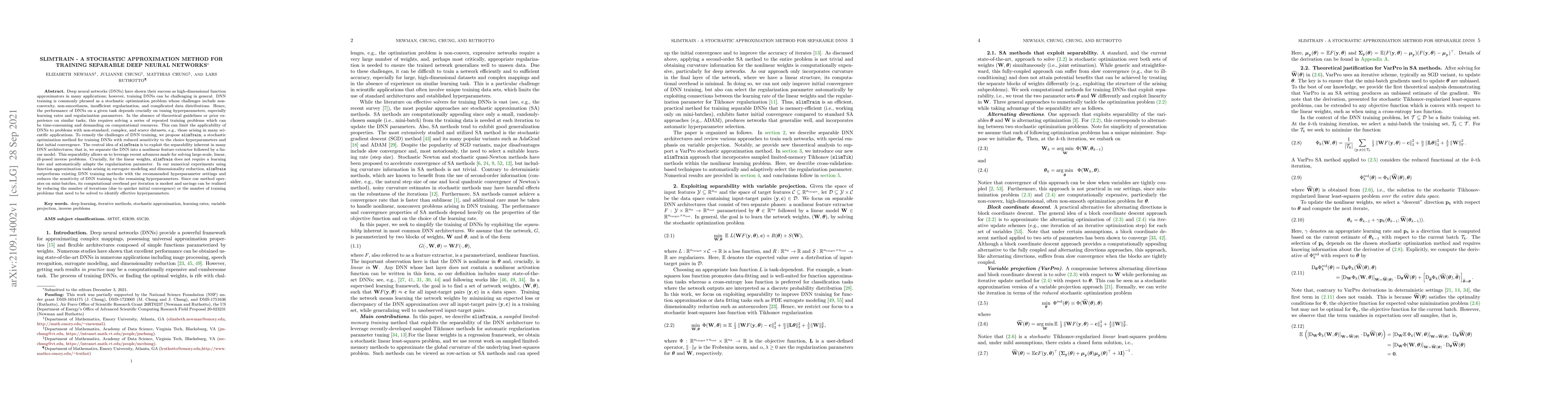 Deep neural networks (DNNs) have shown their success as high-dimensional function approximators in many applications; however, training DNNs can be challenging in general. DNN training is commonly phrased as a stochastic optimization problem whose challenges include non-convexity, non-smoothness, insufficient regularization, and complicated data distributions. Hence, the performance of DNNs on a given task depends crucially on tuning hyperparameters, especially learning rates and regularization parameters. In the absence of theoretical guidelines or prior experience on similar tasks, this requires solving many training problems, which can be time-consuming and demanding on computational resources. This can limit the applicability of DNNs to problems with non-standard, complex, and scarce datasets, e.g., those arising in many scientific applications. To remedy the challenges of DNN training, we propose slimTrain, a stochastic optimization method for training DNNs with reduced sensitivity to the choice hyperparameters and fast initial convergence. The central idea of slimTrain is to exploit the separability inherent in many DNN architectures; that is, we separate the DNN into a nonlinear feature extractor followed by a linear model. This separability allows us to leverage recent advances made for solving large-scale, linear, ill-posed inverse problems. Crucially, for the linear weights, slimTrain does not require a learning rate and automatically adapts the regularization parameter. Since our method operates on mini-batches, its computational overhead per iteration is modest. In our numerical experiments, slimTrain outperforms existing DNN training methods with the recommended hyperparameter settings and reduces the sensitivity of DNN training to the remaining hyperparameters.