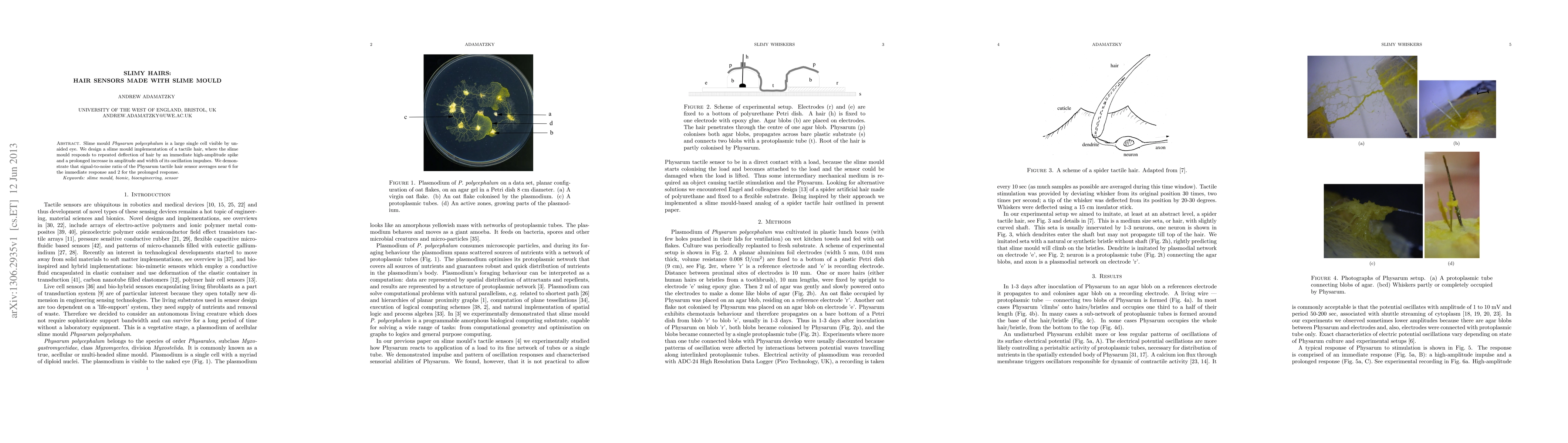 This paper explores the use of slime mould Physarum polycephalum to create tactile hair sensors that respond to deflection with high-amplitude spikes and prolonged oscillation changes, achieving a signal-to-noise ratio of nearly six for immediate responses and two for prolonged ones.