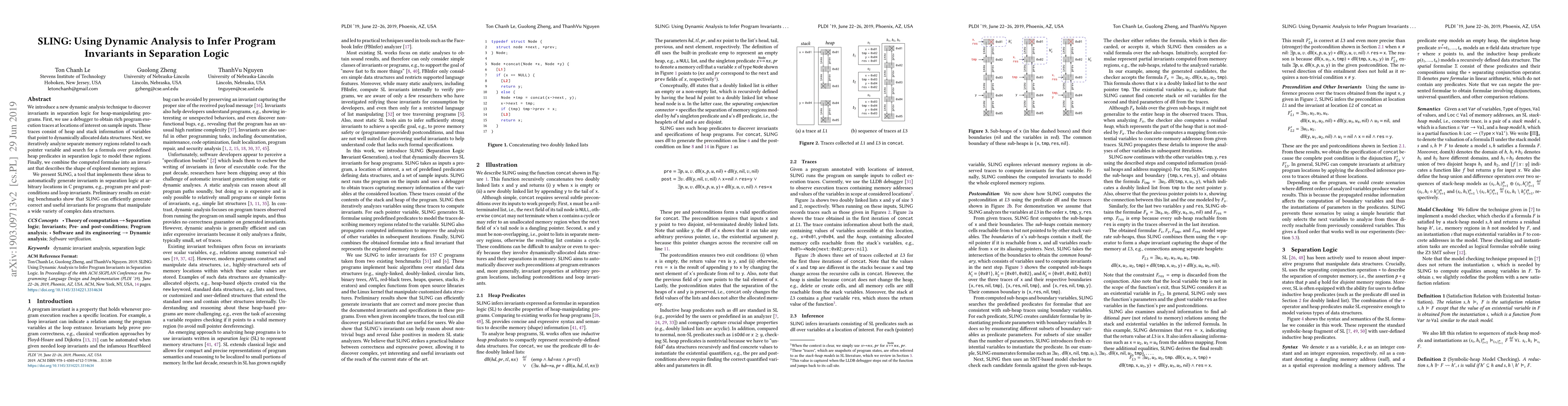 SLING is a dynamic analysis tool that uses execution traces to infer invariants in separation logic for heap-manipulating programs. It combines computed formulae from separate memory regions into an invariant describing the explored memory shape, generating useful pre- and postconditions and loop invariants for C programs.