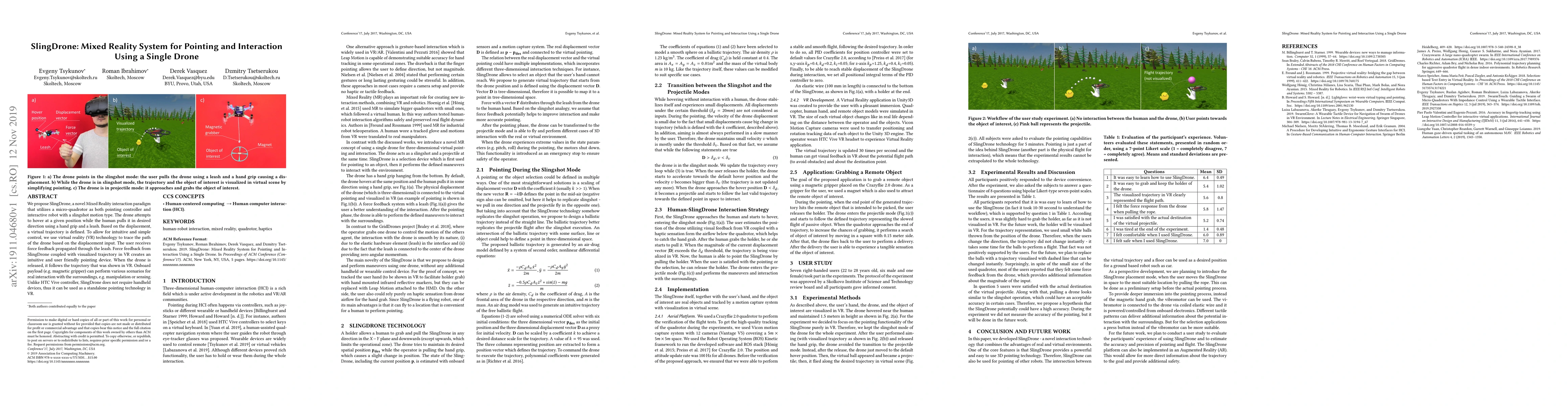 SlingDrone is a mixed reality system using a micro-quadrotor drone for intuitive pointing and interaction via a slingshot mechanism. It leverages VR to visualize the drone's trajectory and provides force feedback, enabling standalone VR interaction without handheld controllers.