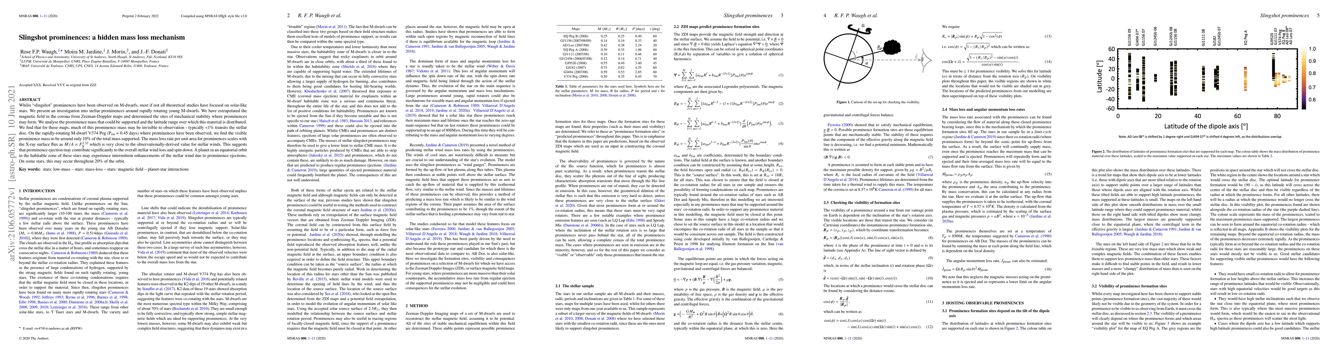 Whilst ``slingshot'' prominences have been observed on M-dwarfs, most if not all theoretical studies have focused on solar-like stars. We present an investigation into stellar prominences around rapidly rotating young M-dwarfs. We have extrapolated the magnetic field in the corona from Zeeman-Doppler maps and determined the sites of mechanical stability where prominences may form. We analyse the prominence mass that could be supported and the latitude range over which this material is distributed. We find that for these maps, much of this prominence mass may be invisible to observation - typically <1\% transits the stellar disc. On the rapidly-rotating M-dwarf V374 Peg (P$_{\rm rot}$ = 0.45 days) where prominences have been observed, we find the visible prominence mass to be around only 10\% of the total mass supported. The mass loss rate per unit area for prominences scales with the X-ray surface flux as $\dot{M}/A \propto$ $F_X^{1.32}$ which is very close to the observationally-derived value for stellar winds. This suggests that prominence ejection may contribute significantly to the overall stellar wind loss and spin down. A planet in an equatorial orbit in the habitable zone of these stars may experience intermittent enhancements of the stellar wind due to prominence ejections. On some stars, this may occur throughout 20\% of the orbit.