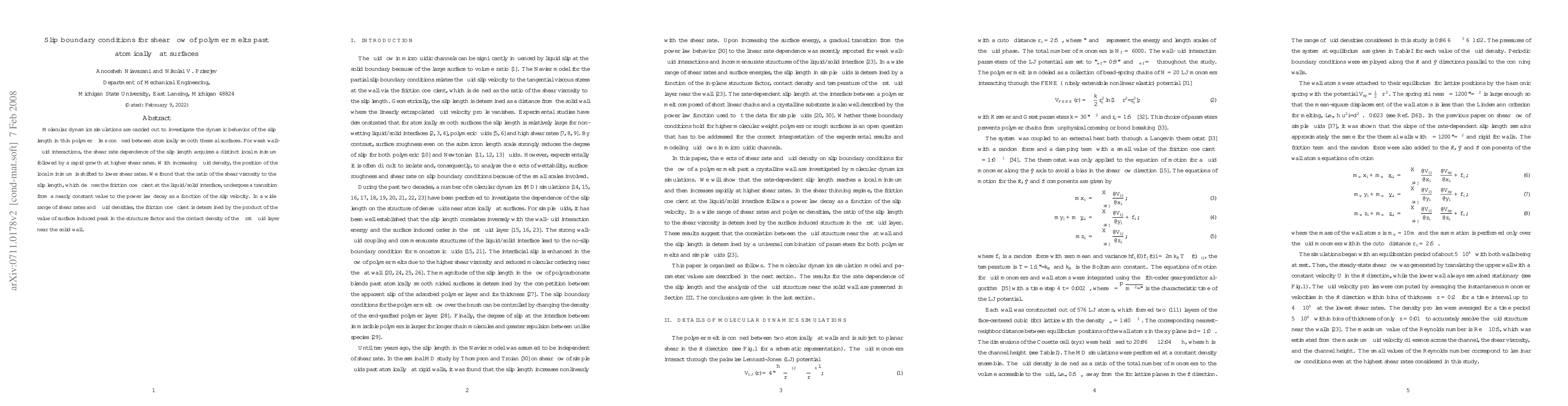 Molecular dynamics simulations reveal that polymer melts exhibit a slip length with a local minimum in shear rate dependence, transitioning to a power law decay at higher shear rates. The friction coefficient at the liquid/solid interface is influenced by the surface-induced peak in the structure factor and the contact density of the first fluid layer.