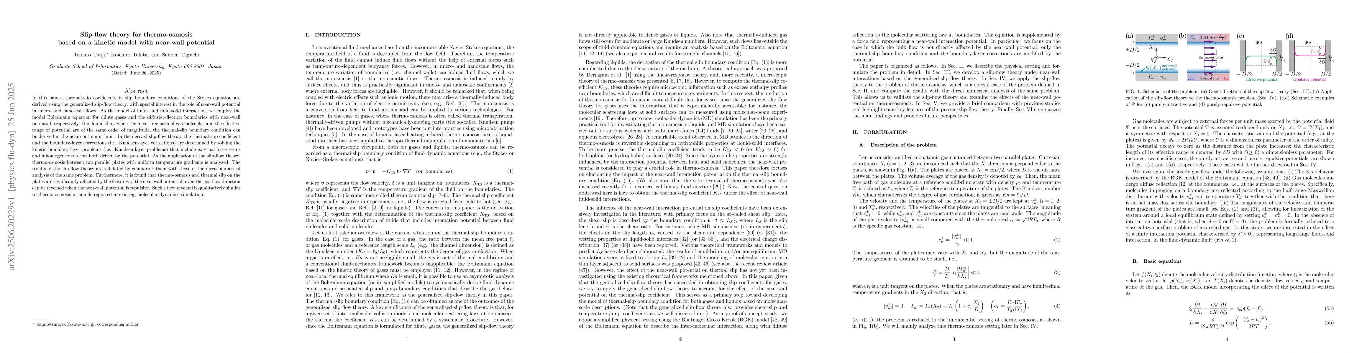 In this paper, thermal-slip coefficients in slip boundary conditions of the Stokes equation are derived using the generalized slip-flow theory, with special interest in the role of near-wall potential in micro- and nanoscale flows. As the model of fluids and fluid-solid interaction, we employ the model Boltzmann equation for dilute gases and the diffuse-reflection boundaries with near-wall potential, respectively. It is found that, when the mean free path of gas molecules and the effective range of potential are of the same order of magnitude, the thermal-slip boundary condition can be derived in the near-continuum limit. In the derived slip-flow theory, the thermal-slip coefficient and the boundary-layer corrections (i.e., Knudsen-layer corrections) are determined by solving the kinetic boundary-layer problems (i.e., Knudsen-layer problems) that include external-force terms and inhomogeneous terms both driven by the potential. As the application of the slip-flow theory, thermo-osmosis between two parallel plates with uniform temperature gradients is analyzed. The results of the slip-flow theory are validated by comparing them with those of the direct numerical analysis of the same problem. Furthermore, it is found that thermo-osmosis and thermal slip on the plates are significantly affected by the features of the near-wall potential; even the gas-flow direction can be reversed when the near-wall potential is repulsive. Such a flow reversal is qualitatively similar to thermo-osmosis in liquids reported in existing molecular dynamics simulation.