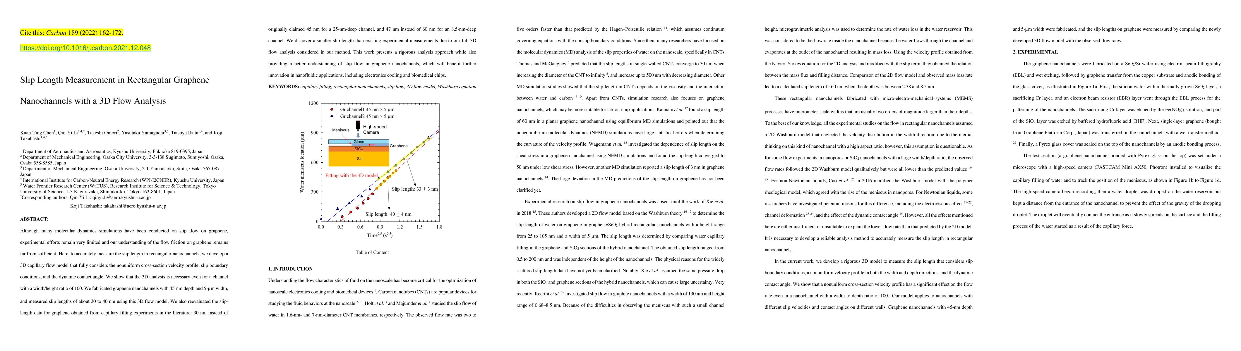 This paper develops a 3D capillary flow model to accurately measure slip length in rectangular graphene nanochannels, revealing slip lengths of 30-40 nm, which are smaller than previously reported values due to the comprehensive 3D analysis. The study highlights the necessity of 3D analysis even for channels with a width/height ratio of 100.