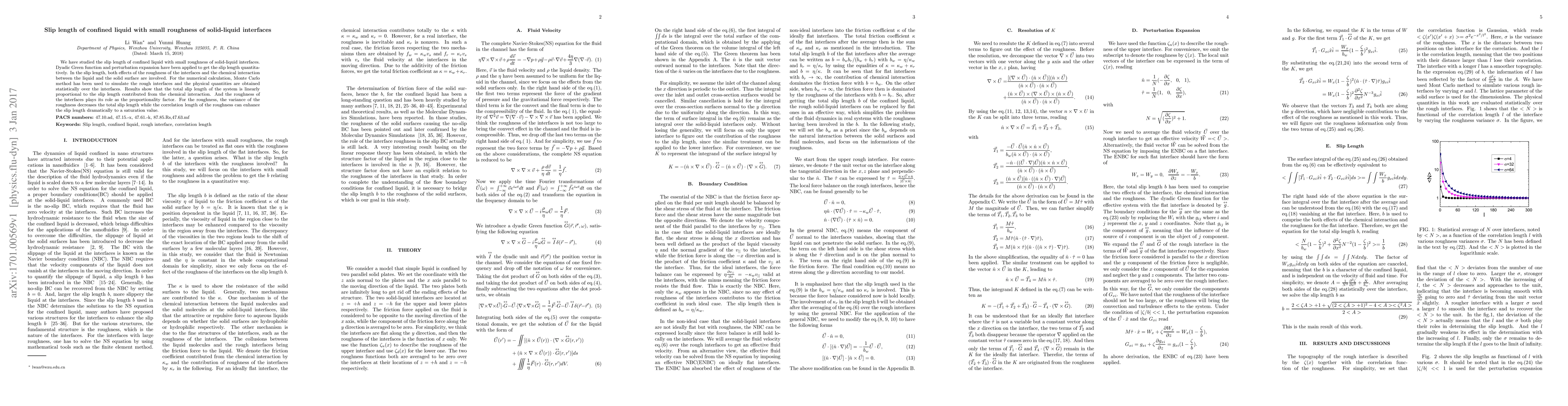 We have studied the slip length of confined liquid with small roughness of solid-liquid interfaces. Dyadic Green function and perturbation expansion have been applied to get the slip length quantitatively. In the slip length, both effects of the roughness of the interfaces and the chemical interaction between the liquid and the solid surface are involved. For the numerical calculation, Monte Carlo method has been used to simulate the rough interfaces and the physical quantities are obtained statistically over the interfaces. Results show that the total slip length of the system is linearly proportional to the slip length contributed from the chemical interaction. And the roughness of the interfaces plays its role as the proportionality factor. For the roughness, the variance of the roughness decreases the total slip length while the correlation length of the roughness can enhance the slip length dramatically to a saturation value.