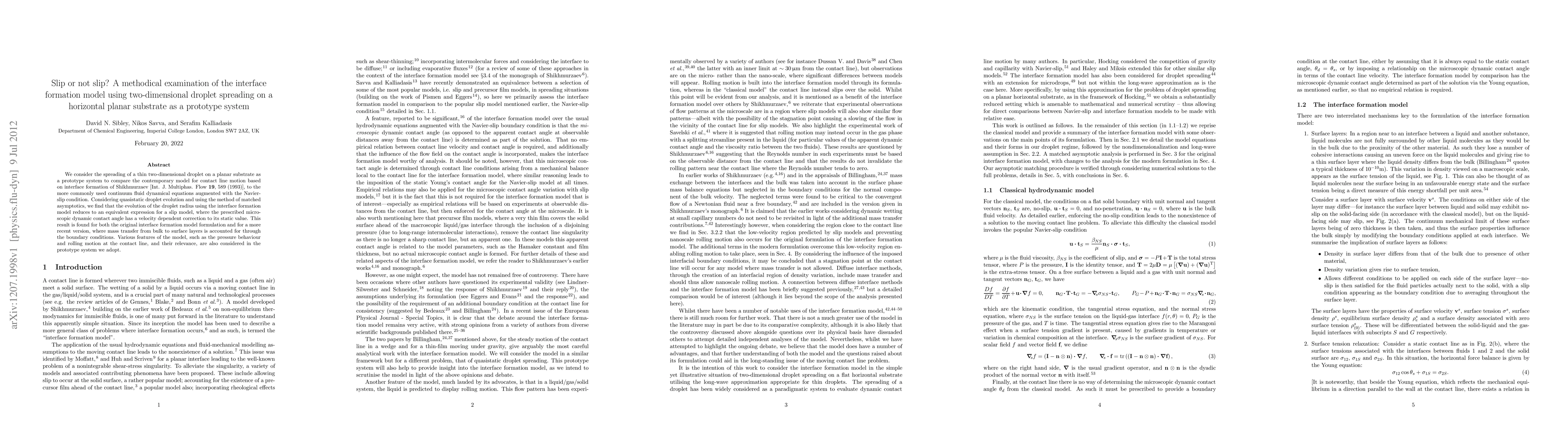 This paper compares two models for contact line motion: Shikhmurzaev's interface formation model and the continuum fluid dynamics model with Navier-slip condition, using two-dimensional droplet spreading on a planar substrate. The study finds that both models yield equivalent results, with the interface formation model showing a velocity-dependent correction to the dynamic contact angle.