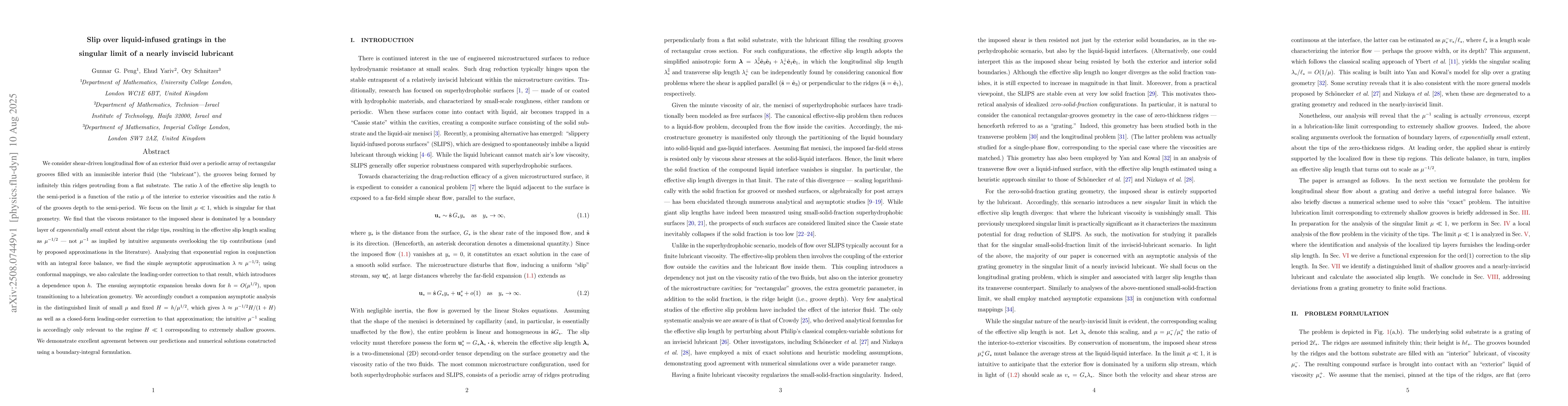 We consider shear-driven longitudinal flow of an exterior fluid over a periodic array of rectangular grooves filled with an immiscible interior fluid (the "lubricant"), the grooves being formed by infinitely thin ridges protruding from a flat substrate. The ratio $\lambda$ of the effective slip length to the semi-period is a function of the ratio $\mu$ of the interior to exterior viscosities and the ratio $h$ of the grooves depth to the semi-period. We focus on the limit $\mu\ll1$, which is singular for that geometry. We find that the viscous resistance to the imposed shear is dominated by a boundary layer of exponentially small extent about the ridge tips, resulting in the effective slip length scaling as $\mu^{-1/2}$ - not $\mu^{-1}$ as implied by intuitive arguments overlooking the tip contributions (and by proposed approximations in the literature). Analyzing that exponential region in conjunction with an integral force balance, we find the simple asymptotic approximation $\lambda\approx \mu^{-1/2}$; using conformal mappings, we also calculate the leading-order correction to that result, which introduces a dependence upon $h$. The ensuing asymptotic expansion breaks down for $h=O(\mu^{1/2})$, upon transitioning to a lubrication geometry. We accordingly conduct a companion asymptotic analysis in the distinguished limit of small $\mu$ and fixed $H=h/\mu^{1/2}$, which gives $\lambda\approx \mu^{-1/2}H/(1+H)$ as well as a closed-form leading-order correction to that approximation; the intuitive $\mu^{-1}$ scaling is accordingly only relevant to the regime $H\ll1$ corresponding to extremely shallow grooves. We demonstrate excellent agreement between our predictions and numerical solutions constructed using a boundary-integral formulation.