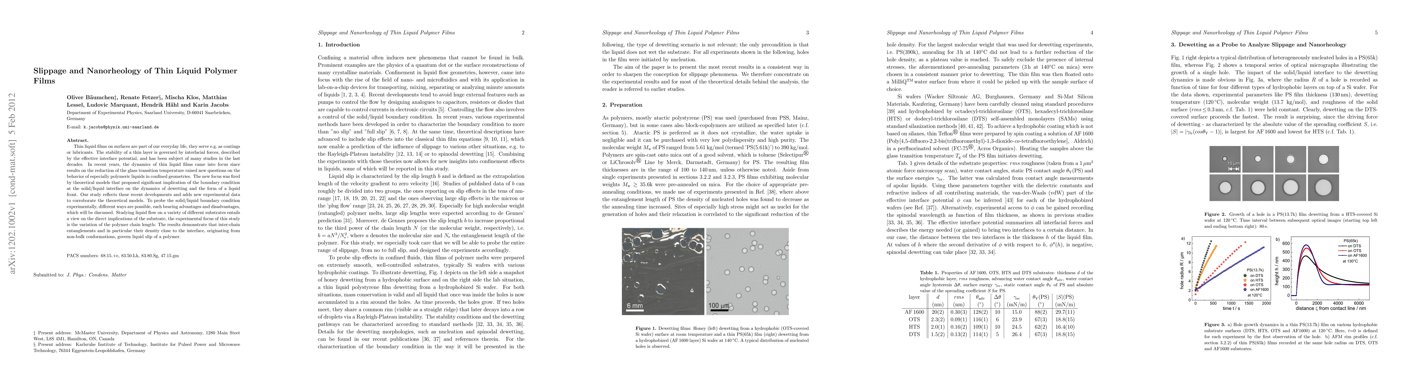 This paper investigates the slippage and nanorheology of thin liquid polymer films, focusing on the impact of polymer chain length and inter-chain entanglements on the liquid film's behavior near solid/liquid interfaces. The study provides experimental data to support theoretical models that highlight the significance of boundary conditions in the dynamics of dewetting and liquid front formation.