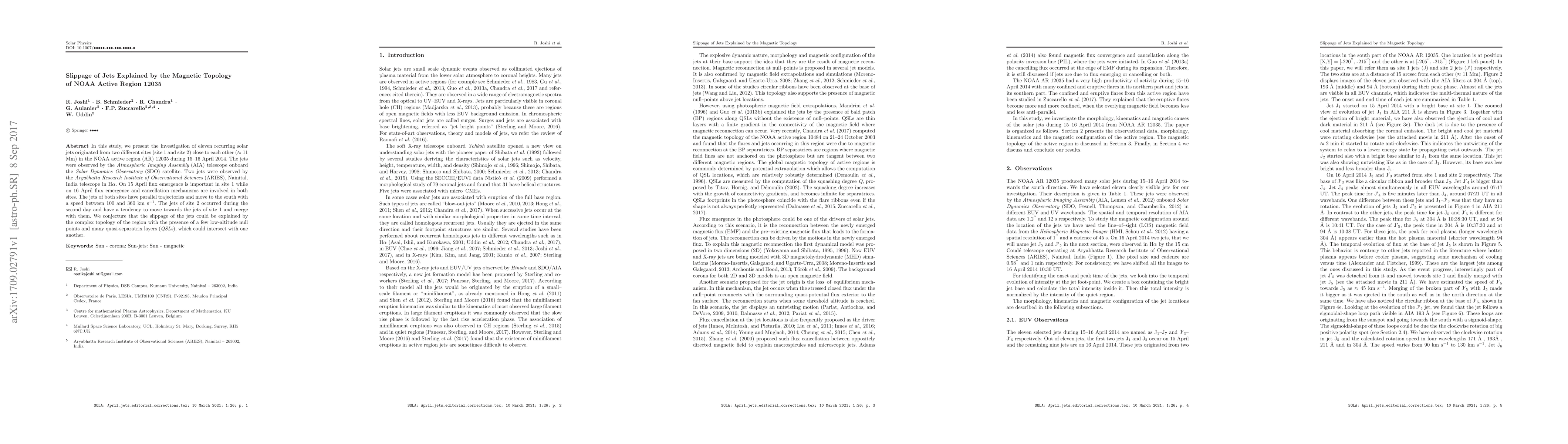 In this study, we present the investigation of eleven recurring solar jets originated from two different sites (site 1 and site 2) close to each other (~ 11 Mm) in the NOAA active region (AR) 12035 during 15--16 April 2014. The jets were observed by the Atmospheric Imaging Assembly (AIA) telescope onboard the Solar Dynamics Observatory (SDO) satellite. Two jets were observed by the Aryabhatta Research Institute of Observational Sciences (ARIES), Nainital, India telescope in H-alpha. On 15 April flux emergence is important in site 1 while on 16 April flux emergence and cancellation mechanisms are involved in both sites. The jets of both sites have parallel trajectories and move to the south with a speed between 100 and 360 km/s. We observed some connection between the two sites with some transfer of brightening. The jets of site 2 occurred during the second day and have a tendency to move towards the jets of site 1 and merge with them. We conjecture that the slippage of the jets could be explained by the complex topology of the region with the presence of a few low-altitude null points and many quasi-separatrix layers (QSLs), which could intersect with one another.