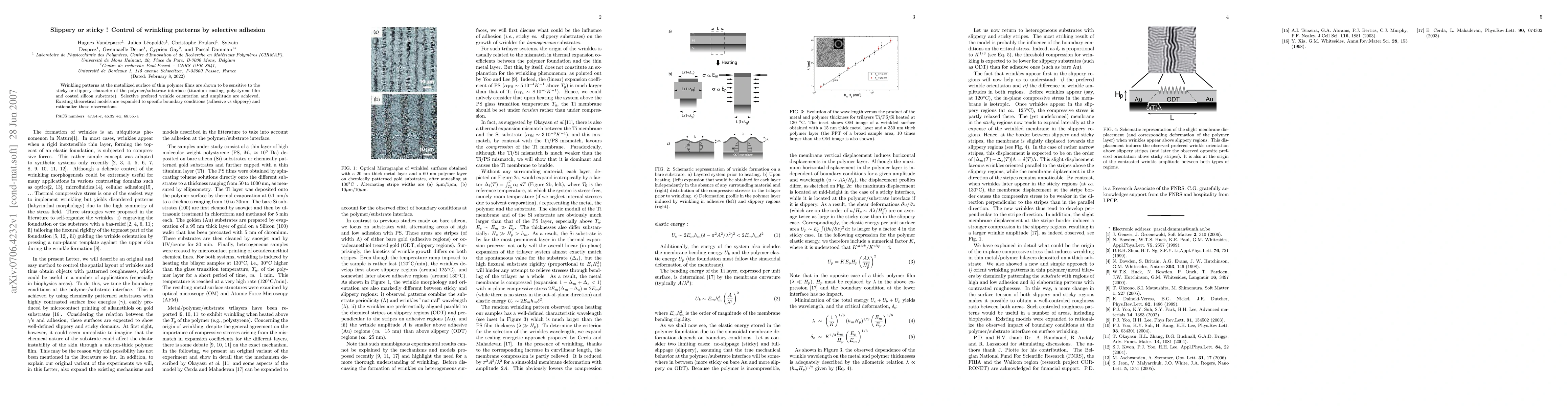 Wrinkling patterns at the metallized surface of thin polymer films are shown to be sensitive to the sticky or slippery character of the polymer/substrate interface (titanium coating, polystyrene film and coated silicon substrate). Selective prefered wrinkle orientation and amplitude are achieved. Existing theoretical models are expanded to specific boundary conditions (adhesive vs slippery) and rationalize these observations.