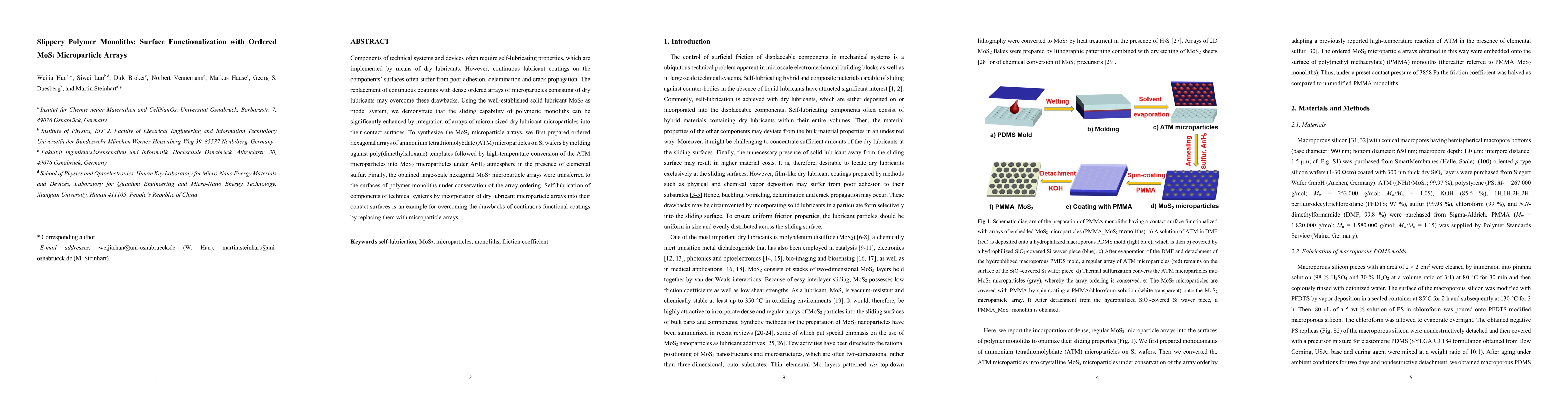 Researchers created a new way to make surfaces self-lubricating by adding tiny arrays of dry lubricant particles to polymer monoliths, improving their sliding capabilities without the need for continuous coatings.