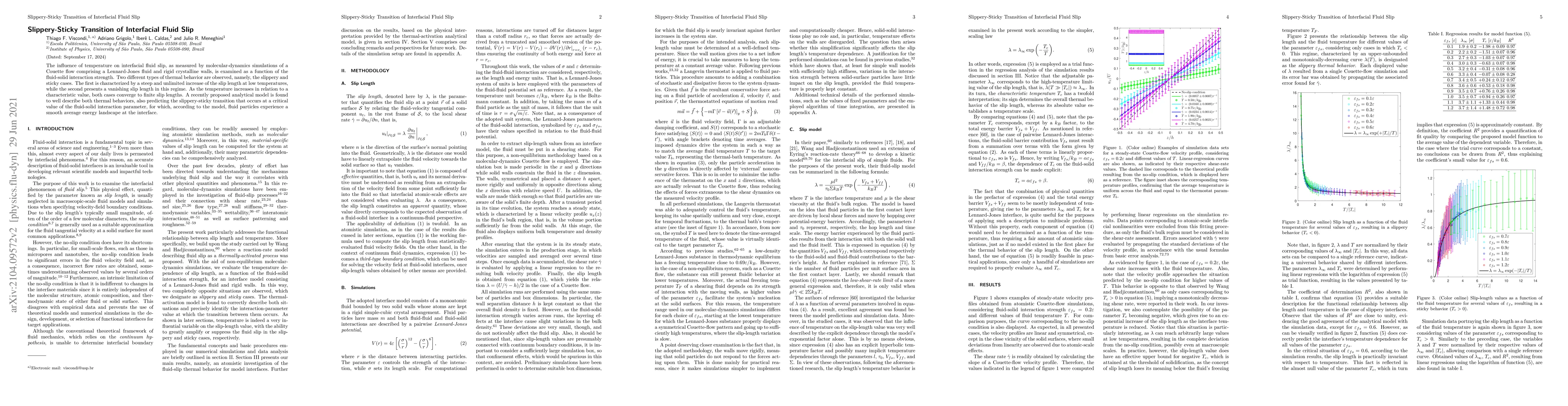 This study, using molecular-dynamics simulations, reveals two thermal behaviors of interfacial fluid slip: slippery (steep increase in slip length at low temperatures) and sticky (vanishing slip length at low temperatures). Both cases converge to finite slip lengths as temperature rises, with a slippery-sticky transition predicted at a critical fluid-solid interaction parameter value, where particles encounter a smooth energy landscape at the interface.