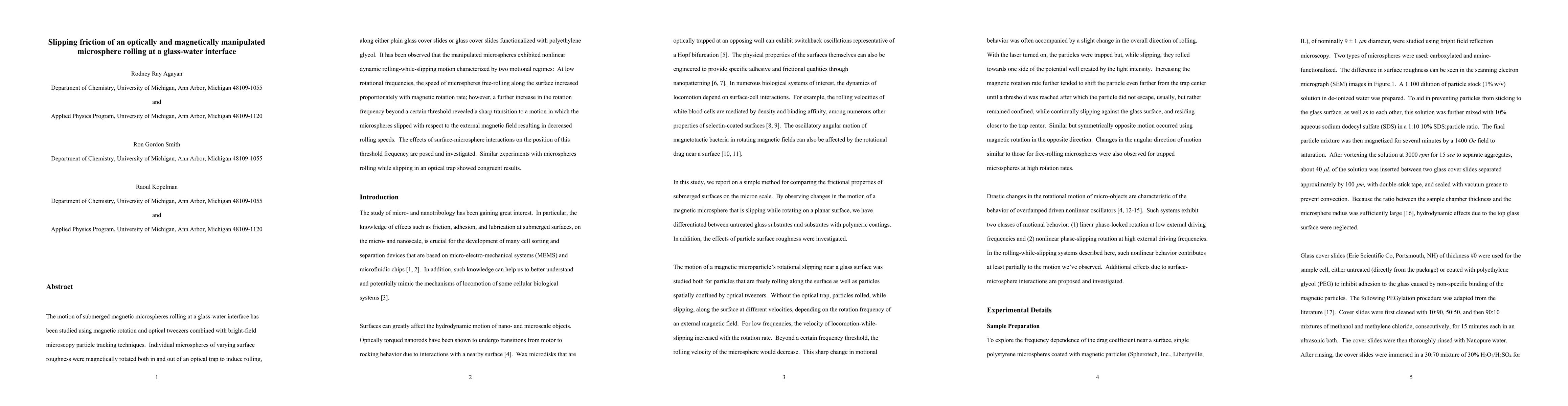 The motion of submerged magnetic microspheres rolling at a glass-water interface has been studied using magnetic rotation and optical tweezers combined with bright-field microscopy particle tracking techniques. Individual microspheres of varying surface roughness were magnetically rotated both in and out of an optical trap to induce rolling, along either plain glass cover slides or glass cover slides functionalized with polyethylene glycol. It has been observed that the manipulated microspheres exhibited nonlinear dynamic rolling-while-slipping motion characterized by two motional regimes: At low rotational frequencies, the speed of microspheres free-rolling along the surface increased proportionately with magnetic rotation rate; however, a further increase in the rotation frequency beyond a certain threshold revealed a sharp transition to a motion in which the microspheres slipped with respect to the external magnetic field resulting in decreased rolling speeds. The effects of surface-microsphere interactions on the position of this threshold frequency are posed and investigated. Similar experiments with microspheres rolling while slipping in an optical trap showed congruent results.