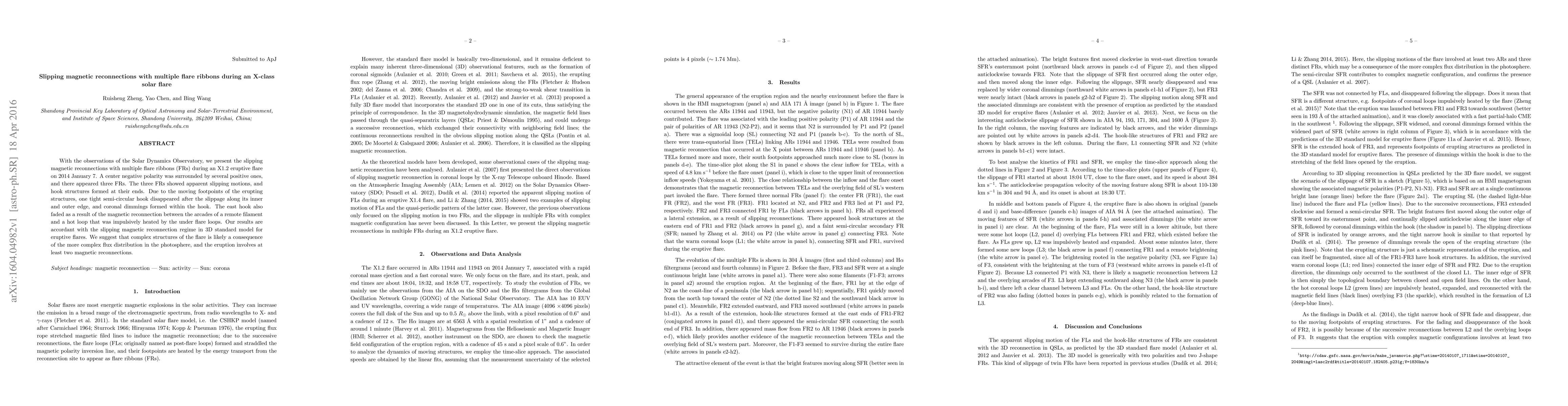 With the observations of the Solar Dynamics Observatory, we present the slipping magnetic reconnections with multiple flare ribbons (FRs) during an X1.2 eruptive flare on 2014 January 7. A center negative polarity was surrounded by several positive ones, and there appeared three FRs. The three FRs showed apparent slipping motions, and hook structures formed at their ends. Due to the moving footpoints of the erupting structures, one tight semi-circular hook disappeared after the slippage along its inner and outer edge, and coronal dimmings formed within the hook. The east hook also faded as a result of the magnetic reconnection between the arcades of a remote filament and a hot loop that was impulsively heated by the under flare loops. Our results are accordant with the slipping magnetic reconnection regime in 3D standard model for eruptive flares. We suggest that complex structures of the flare is likely a consequence of the more complex flux distribution in the photosphere, and the eruption involves at least two magnetic reconnections.