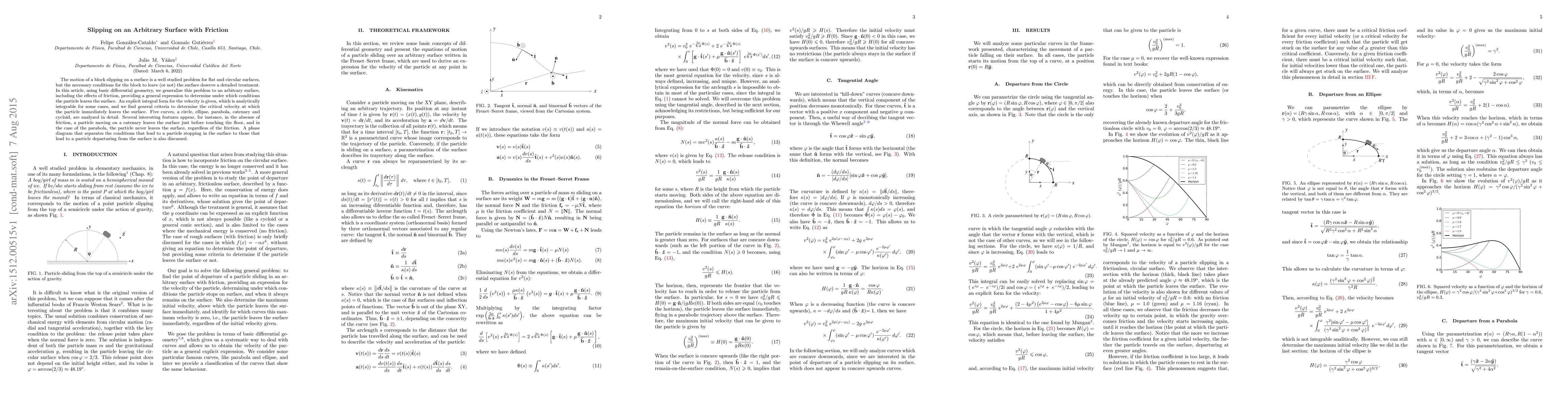 The motion of a block slipping on a surface is a well studied problem for flat and circular surfaces, but the necessary conditions for the block to leave (or not) the surface deserve a detailed treatment. In this article, using basic differential geometry, we generalize this problem to an arbitrary surface, including the effects of friction, providing a general expression to determine under which conditions the particle leaves the surface. An explicit integral form for the velocity is given, which is analytically integrable for some cases, and we find general criteria to determine the critical velocity at which the particle immediately leaves the surface. Five curves, a circle, ellipse, parabola, catenary and cycloid, are analyzed in detail. Several interesting features appear, for instance, in the absense of friction, a particle moving on a catenary leaves the surface just before touching the floor, and in the case of the parabola, the particle never leaves the surface, regardless of the friction. A phase diagram that separates the conditions that lead to a particle stopping in the surface to those that lead to a particle departuring from the surface is also discussed.