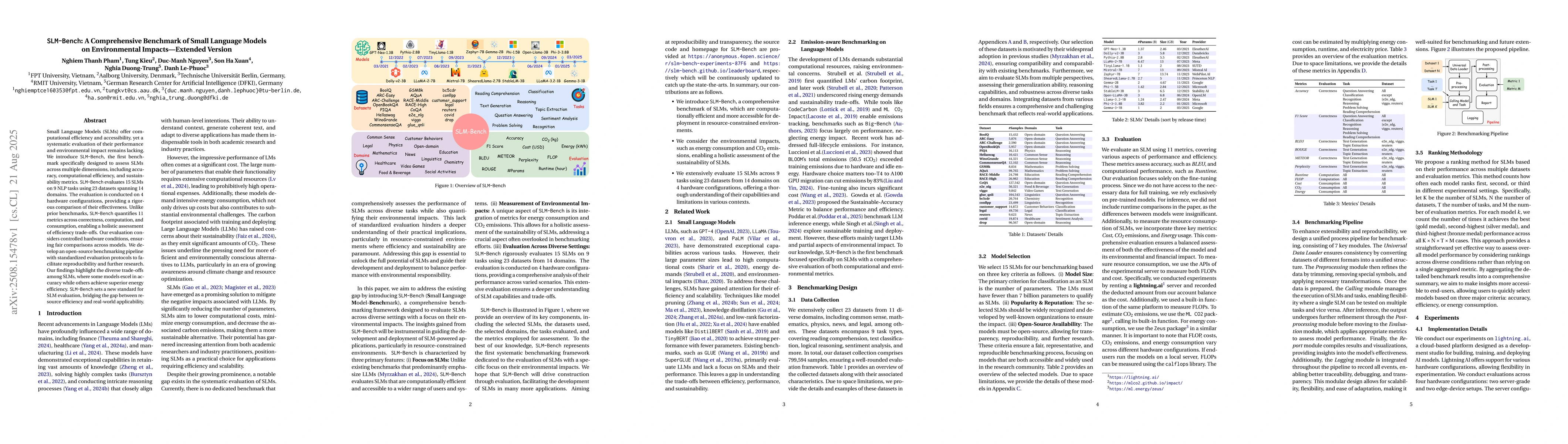 Small Language Models (SLMs) offer computational efficiency and accessibility, yet a systematic evaluation of their performance and environmental impact remains lacking. We introduce SLM-Bench, the first benchmark specifically designed to assess SLMs across multiple dimensions, including accuracy, computational efficiency, and sustainability metrics. SLM-Bench evaluates 15 SLMs on 9 NLP tasks using 23 datasets spanning 14 domains. The evaluation is conducted on 4 hardware configurations, providing a rigorous comparison of their effectiveness. Unlike prior benchmarks, SLM-Bench quantifies 11 metrics across correctness, computation, and consumption, enabling a holistic assessment of efficiency trade-offs. Our evaluation considers controlled hardware conditions, ensuring fair comparisons across models. We develop an open-source benchmarking pipeline with standardized evaluation protocols to facilitate reproducibility and further research. Our findings highlight the diverse trade-offs among SLMs, where some models excel in accuracy while others achieve superior energy efficiency. SLM-Bench sets a new standard for SLM evaluation, bridging the gap between resource efficiency and real-world applicability.