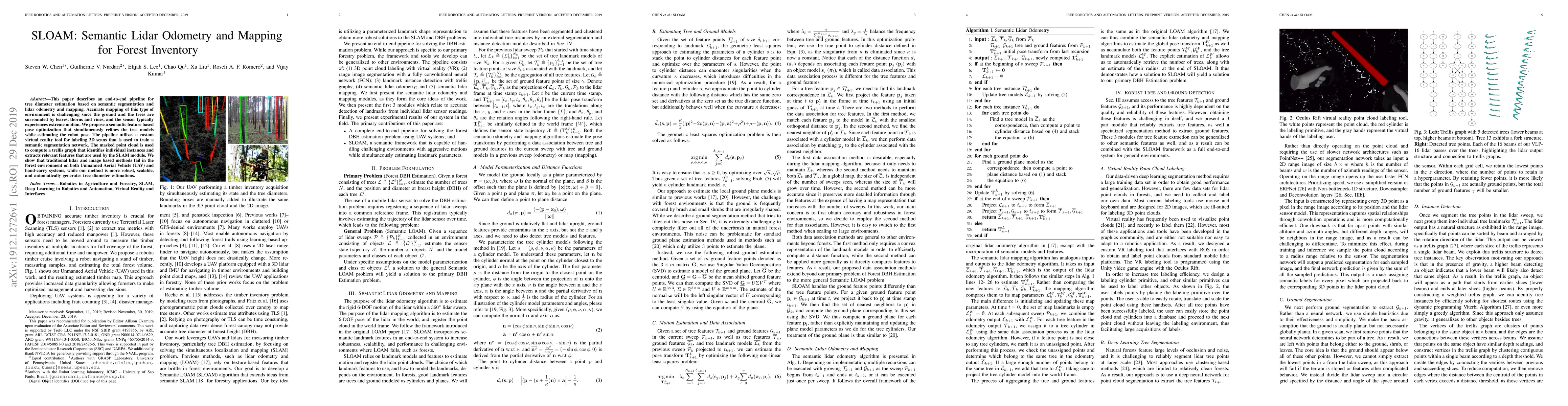 This paper describes an end-to-end pipeline for tree diameter estimation based on semantic segmentation and lidar odometry and mapping. Accurate mapping of this type of environment is challenging since the ground and the trees are surrounded by leaves, thorns and vines, and the sensor typically experiences extreme motion. We propose a semantic feature based pose optimization that simultaneously refines the tree models while estimating the robot pose. The pipeline utilizes a custom virtual reality tool for labeling 3D scans that is used to train a semantic segmentation network. The masked point cloud is used to compute a trellis graph that identifies individual instances and extracts relevant features that are used by the SLAM module. We show that traditional lidar and image based methods fail in the forest environment on both Unmanned Aerial Vehicle (UAV) and hand-carry systems, while our method is more robust, scalable, and automatically generates tree diameter estimations.