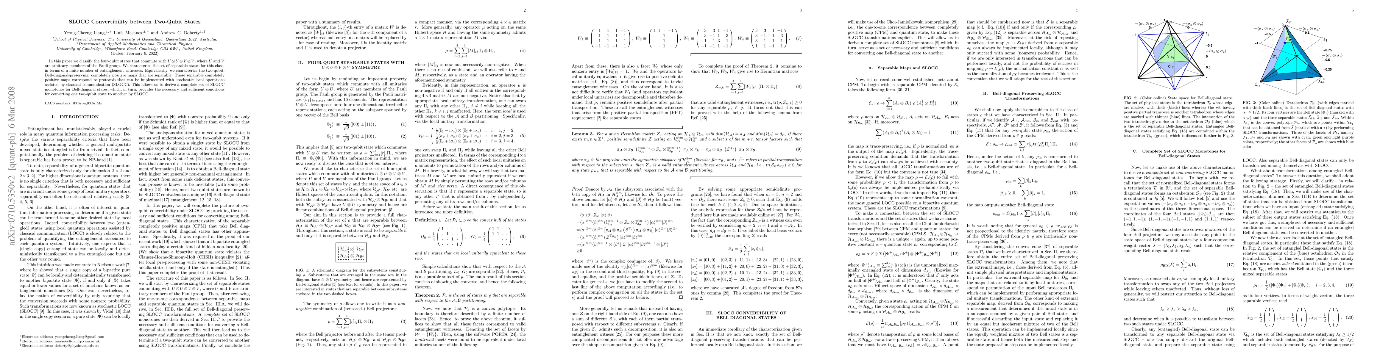 This paper classifies four-qubit states that commute with specific tensor products of Pauli group elements and characterizes separable states within this class using entanglement witnesses. It derives SLOCC monotones for Bell-diagonal states, providing conditions for converting one two-qubit state to another via local operations and classical communication.