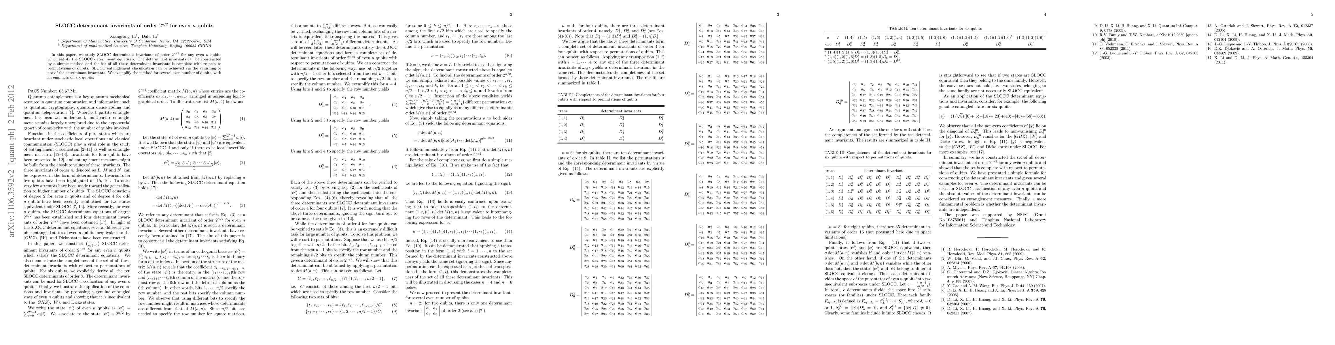 This paper proposes a method to construct SLOCC determinant invariants of order 2^{n/2} for even n qubits, showing their completeness under qubit permutations. These invariants aid in SLOCC entanglement classification by their vanishing or non-vanishing, demonstrated with a focus on six qubits.