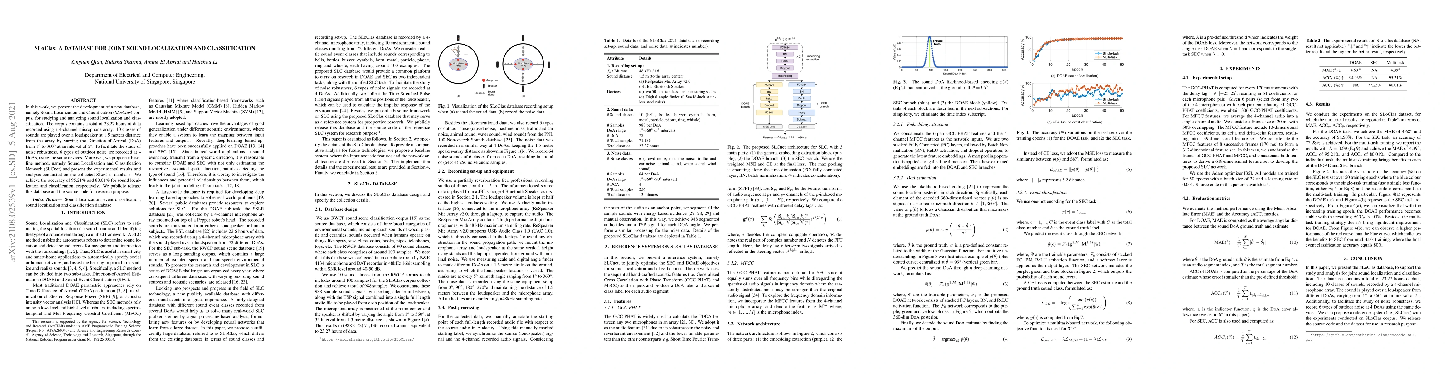 The SLoClas database, comprising 23.27 hours of sound data from a 4-channel microphone array, enables studies on sound localization and classification. The database includes 10 sound classes and outdoor noise, and a baseline network, SLCnet, achieves 95.21% localization and 80.01% classification accuracy.