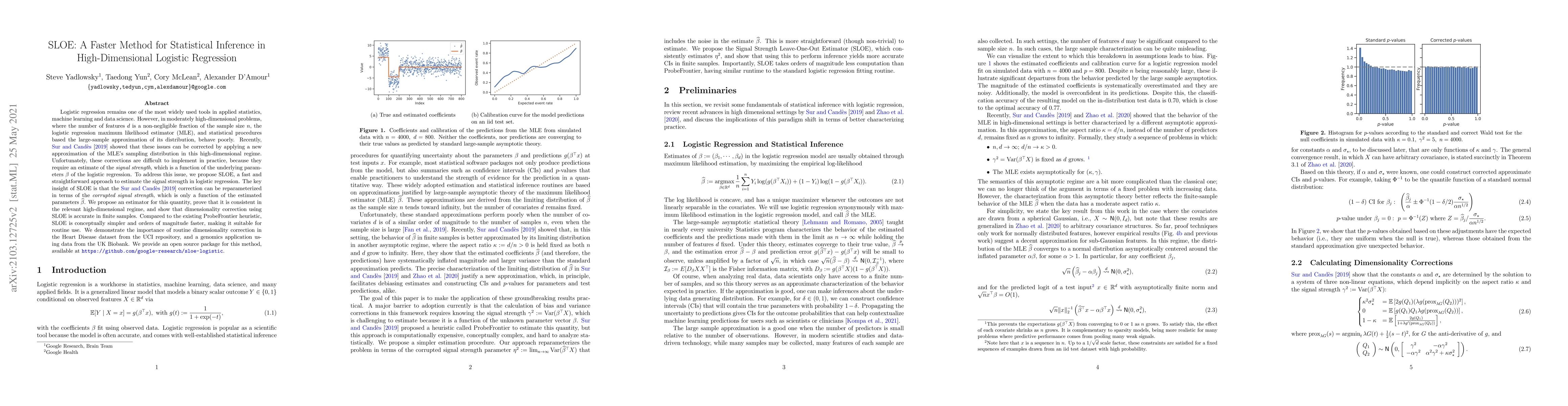 The paper proposes SLOE, a faster method for statistical inference in high-dimensional logistic regression, addressing the poor performance of traditional estimators in high-dimensional settings. SLOE estimates the signal strength more efficiently by reparameterizing the correction method, proving its consistency and accuracy in finite samples, and demonstrating its practical benefits over existing heuristics.