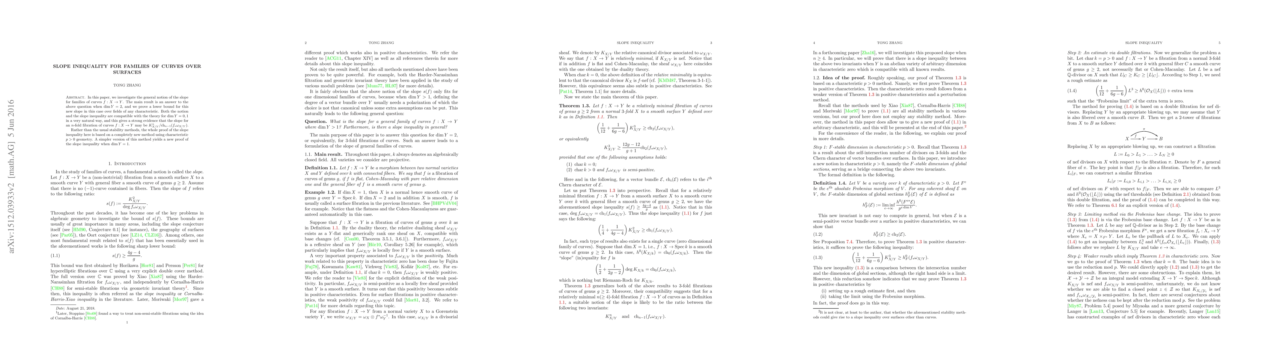 In this paper, we investigate the general notion of the slope for families of curves $f: X \to Y$. The main result is an answer to the above question when $\dim Y = 2$, and we prove a lower bound for this new slope in this case over fields of any characteristic. Both the notion and the slope inequality are compatible with the theory for $\dim Y = 0, 1$ in a very natural way, and this gives a strong evidence that the slope for an $n$-fold fibration of curves $f: X \to Y$ may be $K_{X/Y}^n / \mathrm{ch}_{n-1}(f_* \omega_{X/Y})$. Rather than the usual stability methods, the whole proof of the slope inequality here is based on a completely new method using characteristic $p>0$ geometry. A simpler version of this method yields a new proof of the slope inequality when $\dim Y = 1$.