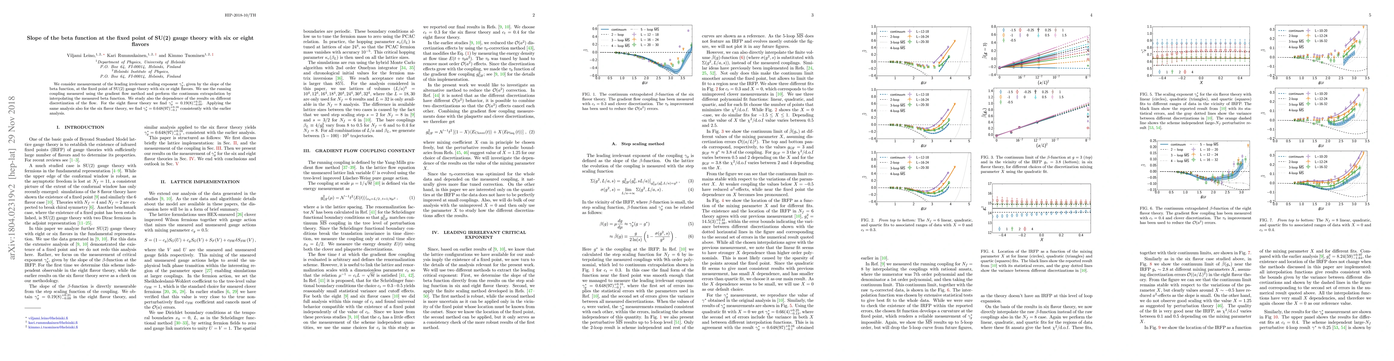 This paper measures the leading irrelevant scaling exponent $\gamma_g^\ast$ in SU(2) gauge theory with six or eight flavors, using the gradient flow method to determine the beta function's slope at the fixed point. Results show $\gamma_g^\ast=0.19(8)$ for eight flavors and $\gamma_g^\ast=0.648(97)$ for six flavors, consistent with previous analyses.