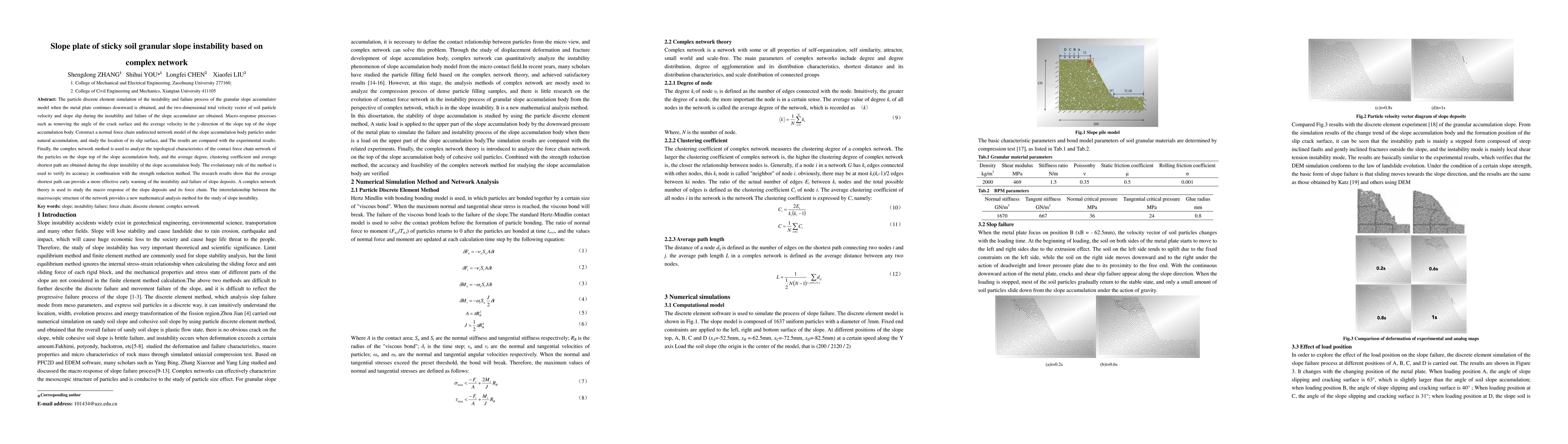 The particle discrete element simulation of the instability and failure process of the granular slope accumulator model when the metal plate continues downward is obtained, and the two-dimensional total velocity vector of soil particle velocity and slope slip during the instability and failure of the slope accumulator are obtained. Macro-response processes such as removing the angle of the crack surface and the average velocity in the y-direction of the slope top of the slope accumulation body. Construct a normal force chain undirected network model of the slope accumulation body particles under natural accumulation, and study the location of its slip surface, and The results are compared with the experimental results. Finally, the complex network method is used to analyze the topological characteristics of the contact force chain network of the particles on the slope top of the slope accumulation body, and the average degree, clustering coefficient and average shortest path are obtained during the slope instability of the slope accumulation body. The evolutionary rule of the method is used to verify its accuracy in combination with the strength reduction method. The research results show that the average shortest path can provide a more effective early warning of the instability and failure of slope deposits. A complex network theory is used to study the macro response of the slope deposits and its force chain. The interrelationship between the macroscopic structure of the network provides a new mathematical analysis method for the study of slope instability.