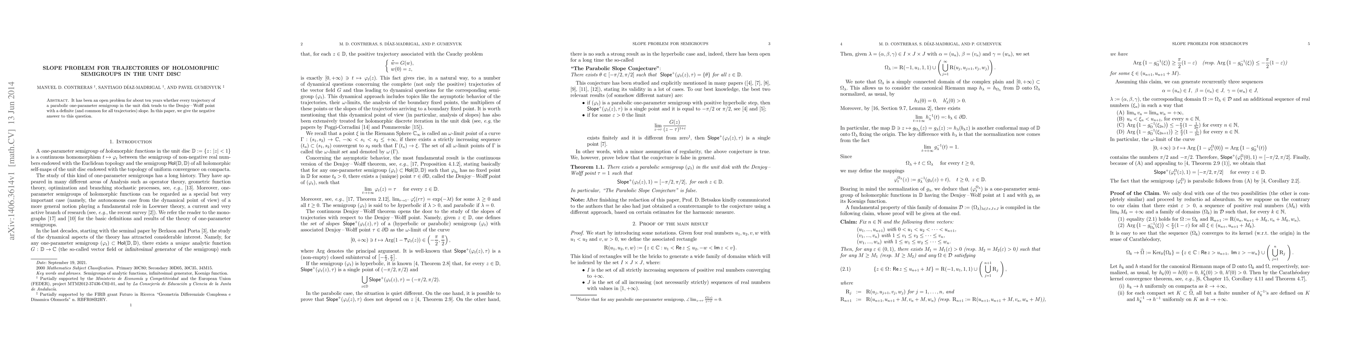 Summary: This paper addresses the long-standing open problem regarding the slope of trajectories for parabolic one-parameter semigroups in the unit disk, concluding that no common slope exists for all trajectories towards the Denjoy-Wolff point.