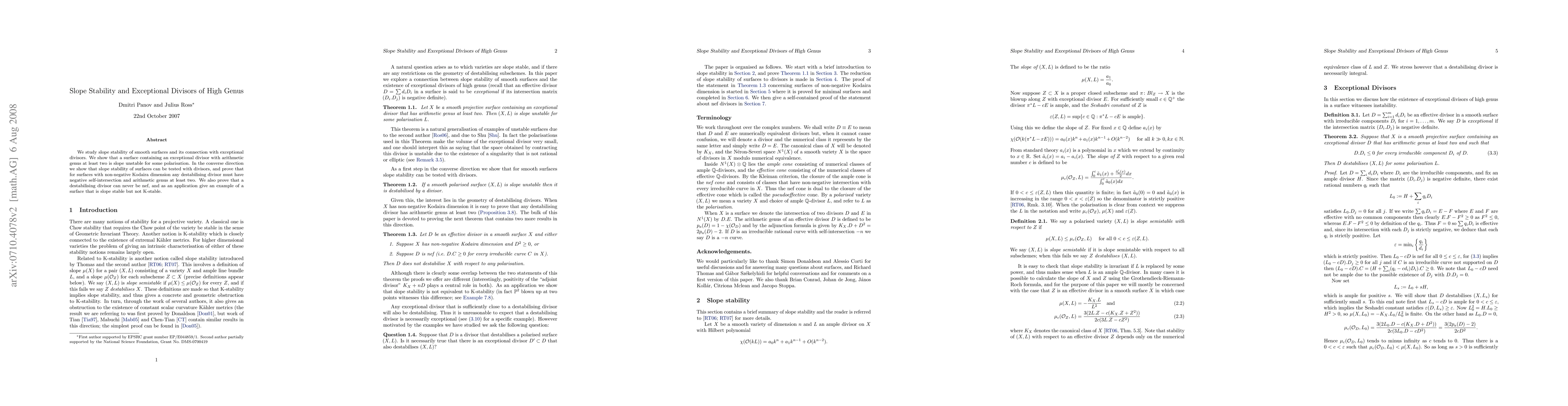 This paper investigates the slope stability of smooth surfaces in relation to exceptional divisors, demonstrating that surfaces with exceptional divisors of arithmetic genus at least two are slope unstable. It also proves that slope stability can be tested using divisors, showing that destabilizing divisors for surfaces with non-negative Kodaira dimension must have negative self-intersection and an arithmetic genus of at least two.