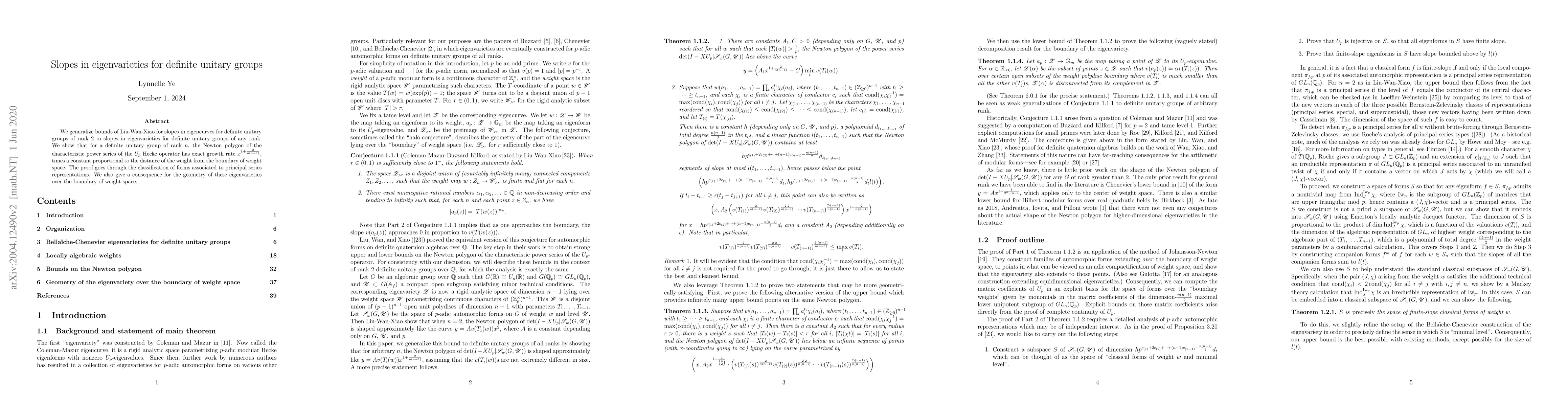 We generalize bounds of Liu-Wan-Xiao for slopes in eigencurves for definite unitary groups of rank $2$ to slopes in eigenvarieties for definite unitary groups of any rank. We show that for a definite unitary group of rank $n$, the Newton polygon of the characteristic power series of the $U_p$ Hecke operator has exact growth rate $x^{1+\frac2{n(n-1)}}$, times a constant proportional to the distance of the weight from the boundary of weight space. The proof goes through the classification of forms associated to principal series representations. We also give a consequence for the geometry of these eigenvarieties over the boundary of weight space.