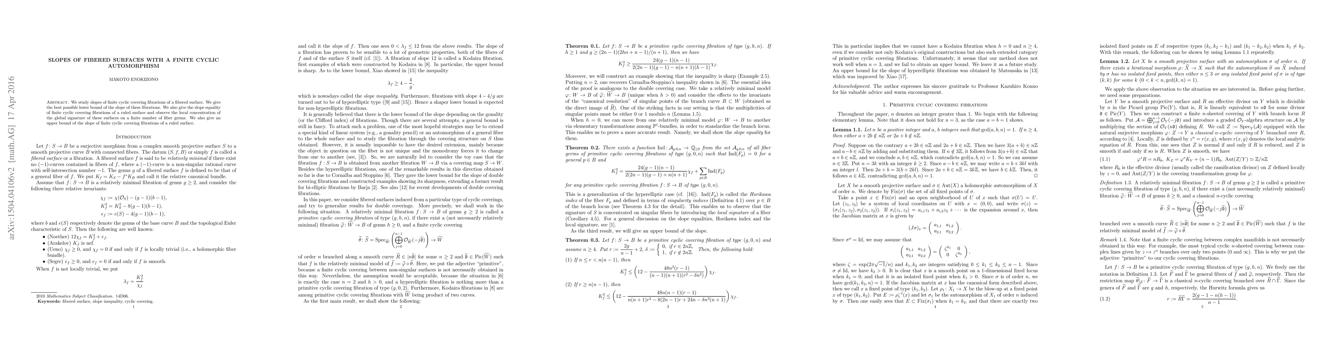 The paper presents detailed calculations and proofs for lower and upper bounds on the slopes of cyclic covering fibrations, introducing the Horikawa index as a tool for analyzing the local signature of fibered surfaces.
