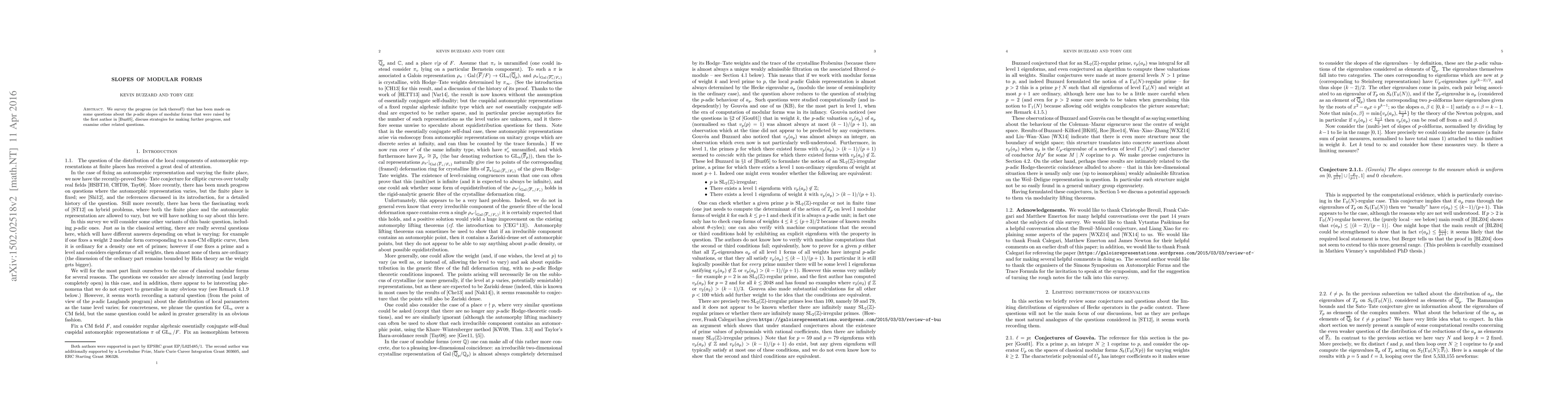We survey the progress (or lack thereof!) that has been made on some questions about the p-adic slopes of modular forms that were raised by the first author in [Buz05], discuss strategies for making further progress, and examine other related questions.