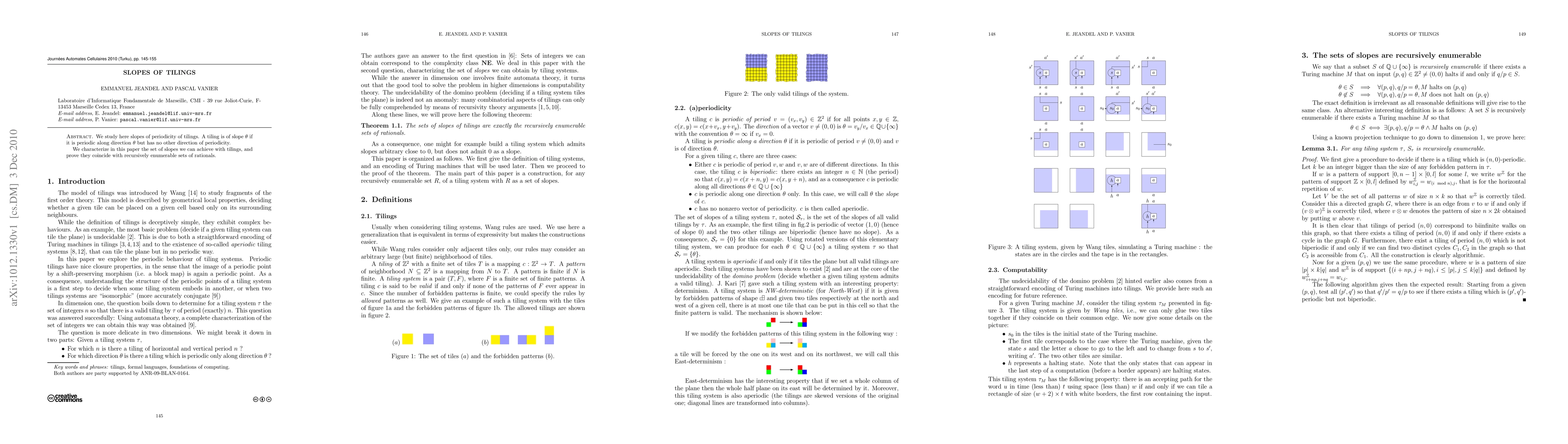 This paper characterizes the set of slopes that can be achieved in periodic tilings, demonstrating that these slopes correspond to recursively enumerable sets of rationals. The study focuses on tilings that exhibit periodicity along a single direction.