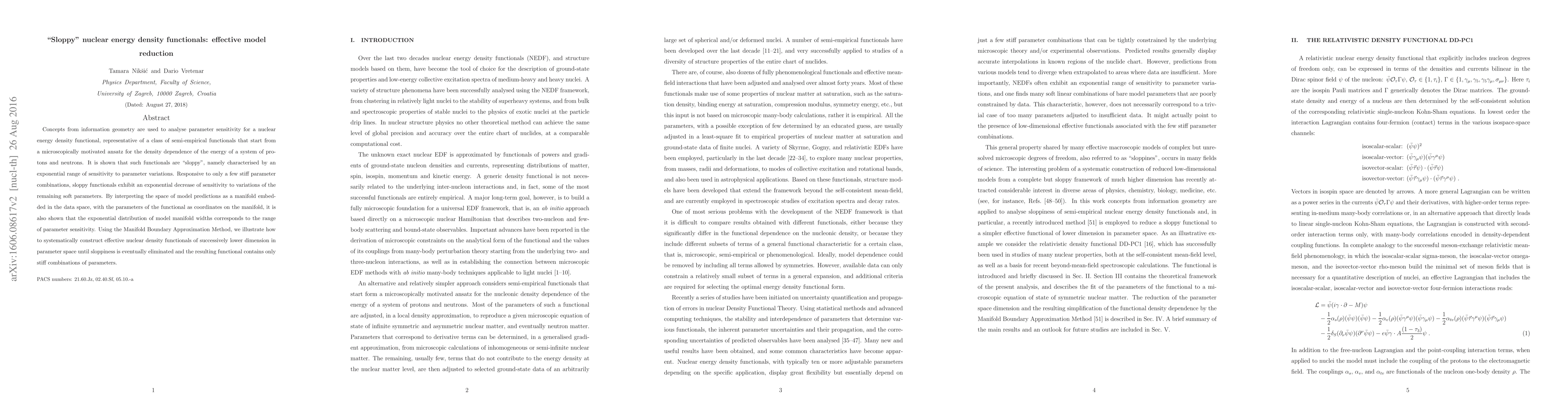 Concepts from information geometry are used to analyse parameter sensitivity for a nuclear energy density functional, representative of a class of semi-empirical functionals that start from a microscopically motivated ansatz for the density dependence of the energy of a system of protons and neutrons. It is shown that such functionals are sloppy, characterized by an exponential range of sensitivity to parameter variations. Responsive to only a few stiff parameter combinations, they exhibit an exponential decrease of sensitivity to variations of the remaining soft parameters. By interpreting the space of model predictions as a manifold embedded in the data space, with the parameters of the functional as coordinates on the manifold, it is also shown that the exponential distribution of model manifold widths corresponds to the distribution of parameter sensitivity. Using the Manifold Boundary Approximation Method, we illustrate how to systematically construct effective nuclear density functionals of successively lower dimension in parameter space until sloppiness is eventually eliminated and the resulting functional contains only stiff combinations of parameters.