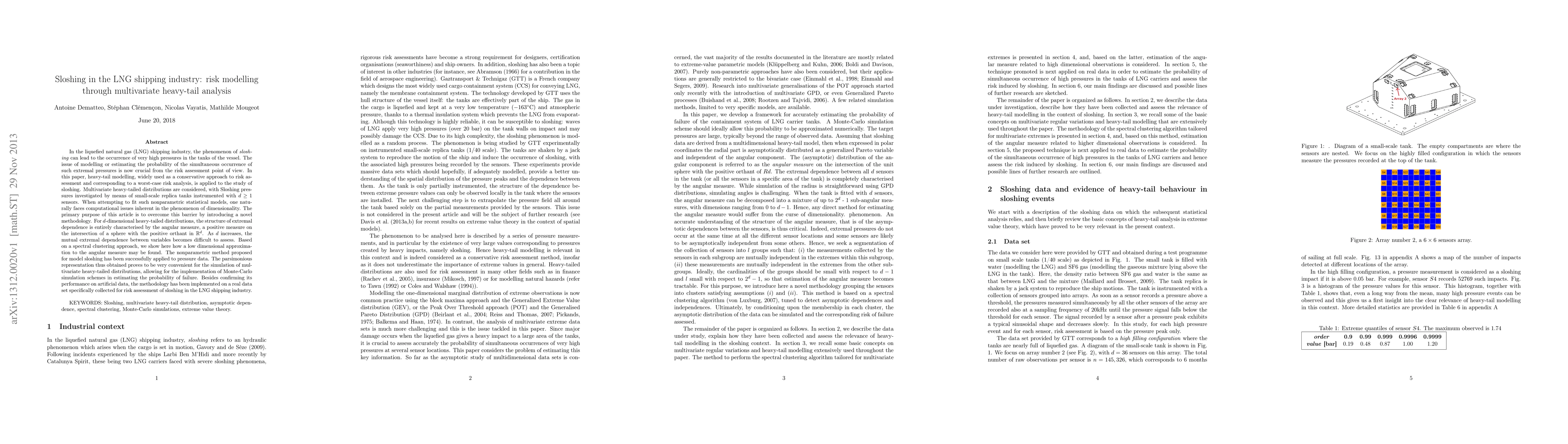 In the liquefied natural gas (LNG) shipping industry, the phenomenon of sloshing can lead to the occurrence of very high pressures in the tanks of the vessel. The issue of modelling or estimating the probability of the simultaneous occurrence of such extremal pressures is now crucial from the risk assessment point of view. In this paper, heavy-tail modelling, widely used as a conservative approach to risk assessment and corresponding to a worst-case risk analysis, is applied to the study of sloshing. Multivariate heavy-tailed distributions are considered, with Sloshing pressures investigated by means of small-scale replica tanks instrumented with d >1 sensors. When attempting to fit such nonparametric statistical models, one naturally faces computational issues inherent in the phenomenon of dimensionality. The primary purpose of this article is to overcome this barrier by introducing a novel methodology. For d-dimensional heavy-tailed distributions, the structure of extremal dependence is entirely characterised by the angular measure, a positive measure on the intersection of a sphere with the positive orthant in Rd. As d increases, the mutual extremal dependence between variables becomes difficult to assess. Based on a spectral clustering approach, we show here how a low dimensional approximation to the angular measure may be found. The nonparametric method proposed for model sloshing has been successfully applied to pressure data. The parsimonious representation thus obtained proves to be very convenient for the simulation of multivariate heavy-tailed distributions, allowing for the implementation of Monte-Carlo simulation schemes in estimating the probability of failure. Besides confirming its performance on artificial data, the methodology has been implemented on a real data set specifically collected for risk assessment of sloshing in the LNG shipping industry.