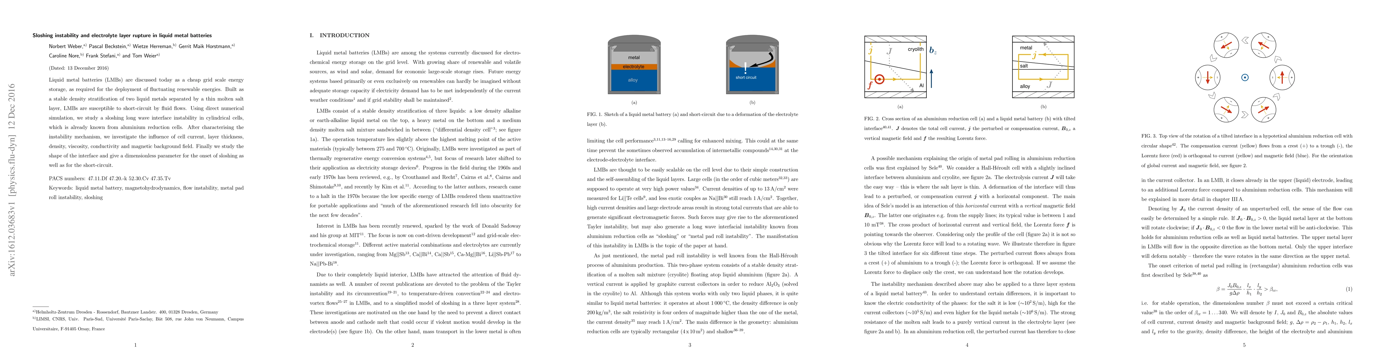 Liquid metal batteries (LMBs) are discussed today as a cheap grid scale energy storage, as required for the deployment of fluctuating renewable energies. Built as a stable density stratification of two liquid metals separated by a thin molten salt layer, LMBs are susceptible to short-circuit by fluid flows. Using direct numerical simulation, we study a sloshing long wave interface instability in cylindrical cells, which is already known from aluminium reduction cells. After characterising the instability mechanism, we investigate the influence of cell current, layer thickness, density, viscosity, conductivity and magnetic background field. Finally we study the shape of the interface and give a dimensionless parameter for the onset of sloshing as well as for the short-circuit.
