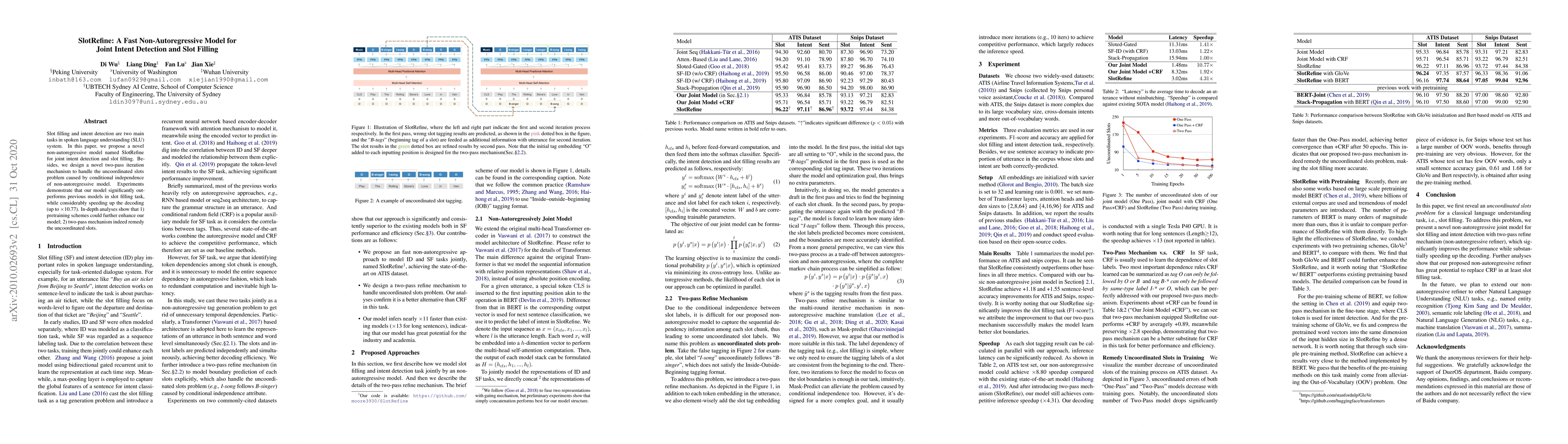 Title: SlotRefine: A Fast Non-Autoregressive Model for Joint Intent Detection and Slot Filling Summary: This paper introduces SlotRefine, a non-autoregressive model for joint intent detection and slot filling in SLU systems, featuring a two-pass iteration mechanism to address uncoordinated slots. Experiments show significant improvements in slot filling performance and a notable speedup in decoding.