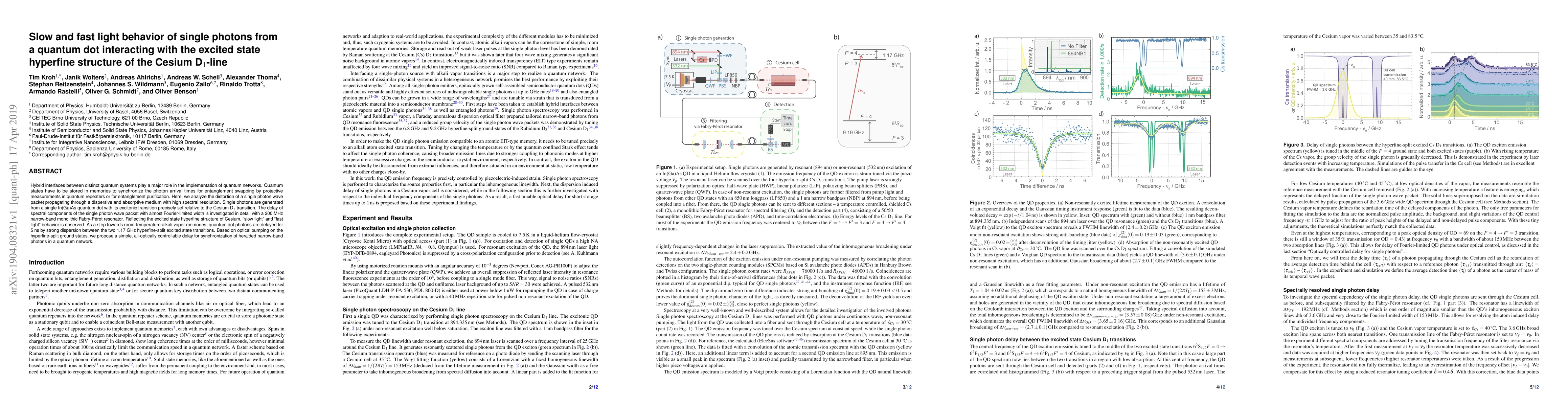 Hybrid interfaces between distinct quantum systems play a major role in the implementation of quantum networks. Quantum states have to be stored in memories to synchronize the photon arrival times for entanglement swapping by projective measurements in quantum repeaters or for entanglement purification. Here, we analyze the distortion of a single photon wave packet propagating through a dispersive and absorptive medium with high spectral resolution. Single photons are generated from a single In(Ga)As quantum dot with its excitonic transition precisely set relative to the Cesium D1 transition. The delay of spectral components of the single photon wave packet with almost Fourier-limited width is investigated in detail with a 200 MHz narrow-band monolithic Fabry-P\'erot resonator. Reflecting the excited state hyperfine structure of Cesium, "slow light" and "fast light" behavior is observed. As a step towards room-temperature alkali vapor memories, quantum dot photons are delayed for 5 ns by strong dispersion between the two 1.17 GHz hyperfine-split excited state transitions. Based on optical pumping on the hyperfine-split ground states, we propose a simple, all-optically controllable delay for synchronization of heralded narrow-band photons in a quantum network.
