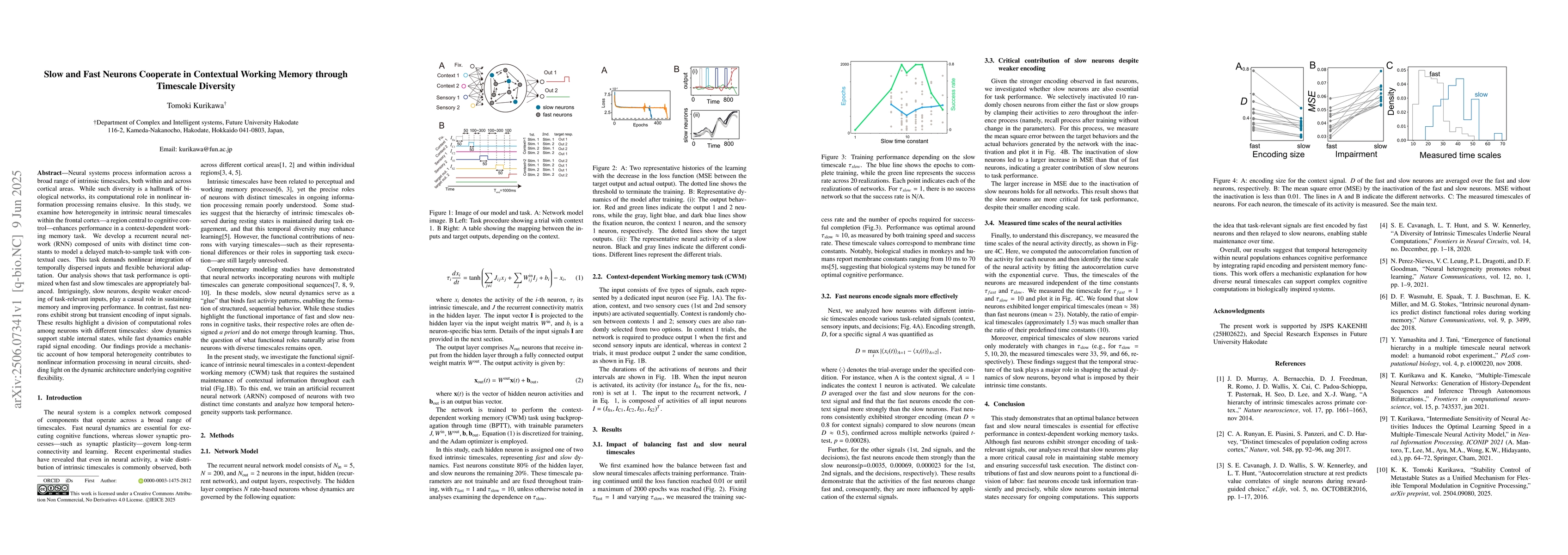 Neural systems process information across a broad range of intrinsic timescales, both within and across cortical areas. While such diversity is a hallmark of biological networks, its computational role in nonlinear information processing remains elusive. In this study, we examine how heterogeneity in intrinsic neural timescales within the frontal cortex - a region central to cognitive control - enhances performance in a context-dependent working memory task. We develop a recurrent neural network (RNN) composed of units with distinct time constants to model a delayed match-to-sample task with contextual cues. This task demands nonlinear integration of temporally dispersed inputs and flexible behavioral adaptation. Our analysis shows that task performance is optimized when fast and slow timescales are appropriately balanced. Intriguingly, slow neurons, despite weaker encoding of task-relevant inputs, play a causal role in sustaining memory and improving performance. In contrast, fast neurons exhibit strong but transient encoding of input signals. These results highlight a division of computational roles among neurons with different timescales: slow dynamics support stable internal states, while fast dynamics enable rapid signal encoding. Our findings provide a mechanistic account of how temporal heterogeneity contributes to nonlinear information processing in neural circuits, shedding light on the dynamic architecture underlying cognitive flexibility.