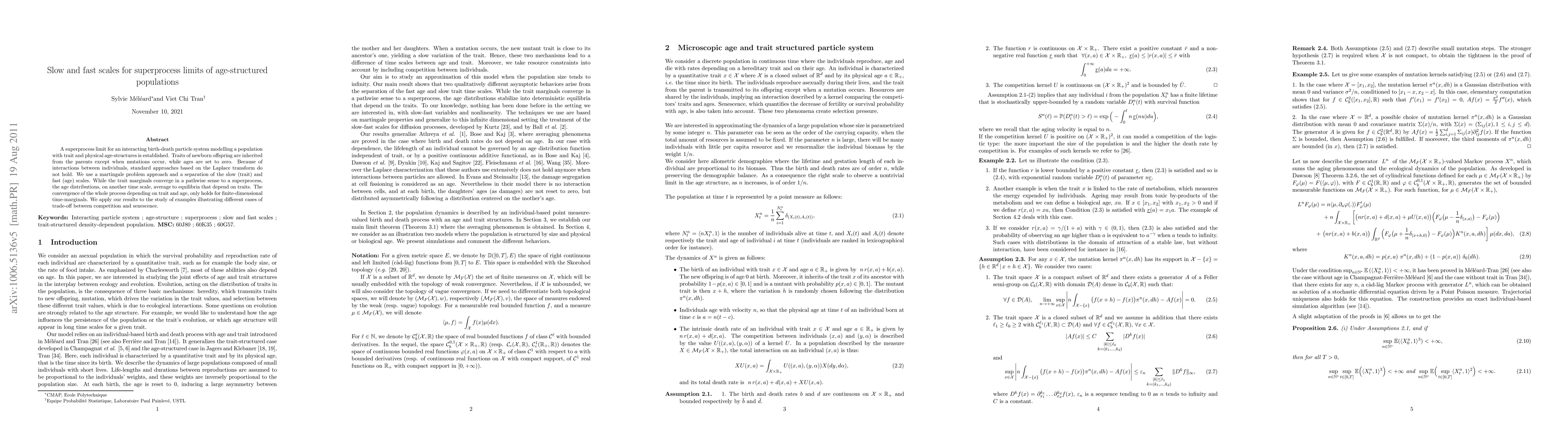 A superprocess limit for an interacting birth-death particle system modelling a population with trait and physical age-structures is established. Traits of newborn offspring are inherited from the parents except when mutations occur, while ages are set to zero. Because of interactions between individuals, standard approaches based on the Laplace transform do not hold. We use a martingale problem approach and a separation of the slow (trait) and fast (age) scales. While the trait marginals converge in a pathwise sense to a superprocess, the age distributions, on another time scale, average to equilibria that depend on traits. The convergence of the whole process depending on trait and age, only holds for finite-dimensional time-marginals. We apply our results to the study of examples illustrating different cases of trade-off between competition and senescence.